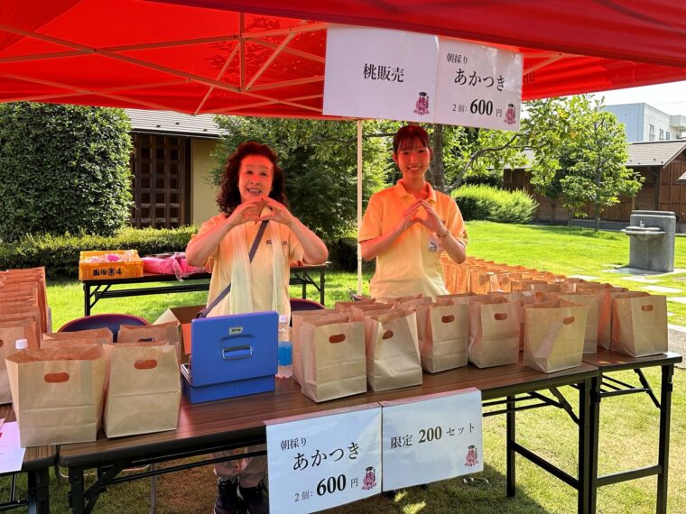桃の振る舞いは午前と午後の計2回行われ、こちらも大人気! かたくて甘いあかつきに「甘い!おいしい!」の声と笑顔があふれました。