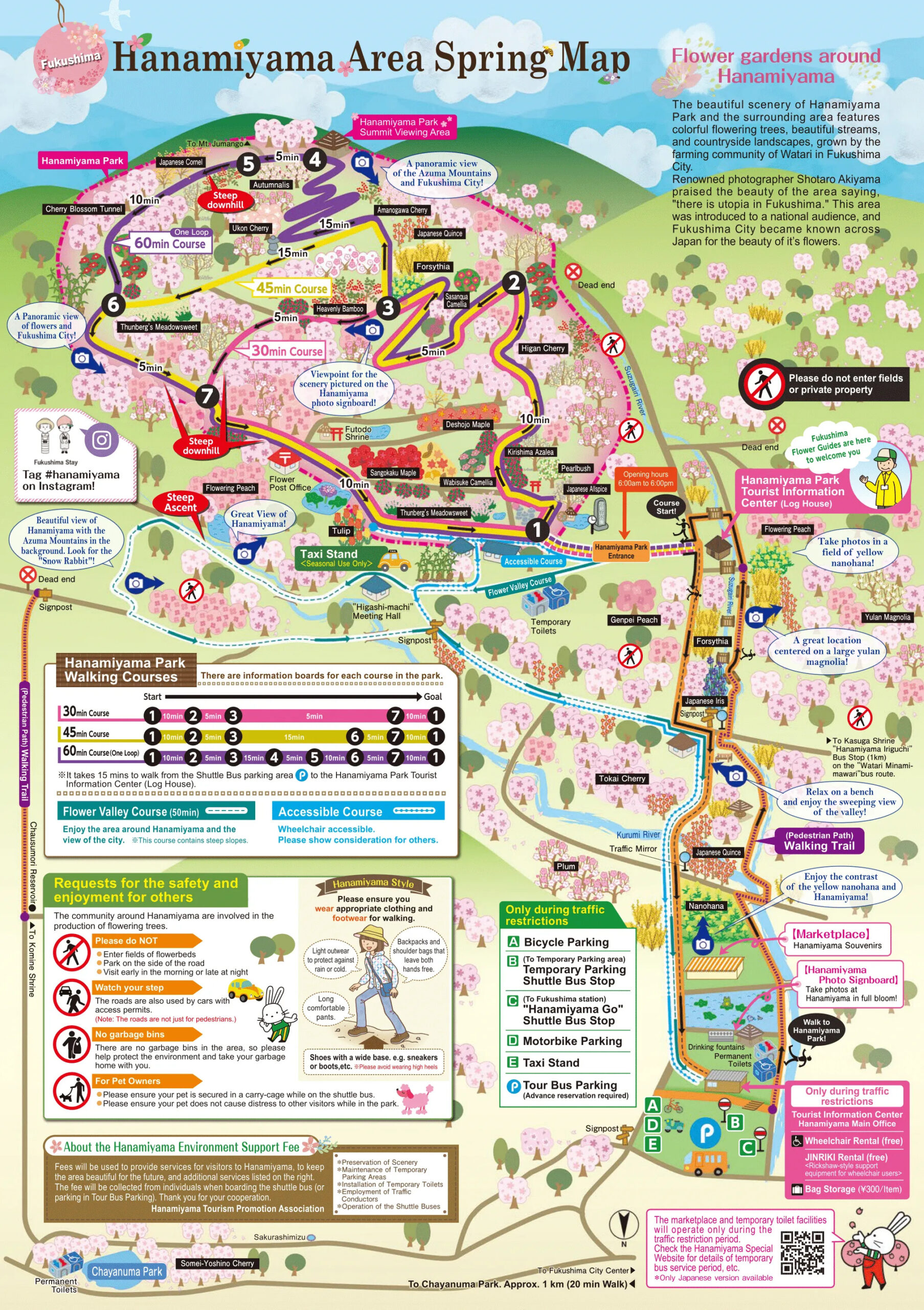 Peak Season: Temporary parking is available at Abukuma Shinsui Park on the east side of the Abukuma River. A shuttle bus runs from the temporary parking area to Hanamiyama Park (500 yen / person).
