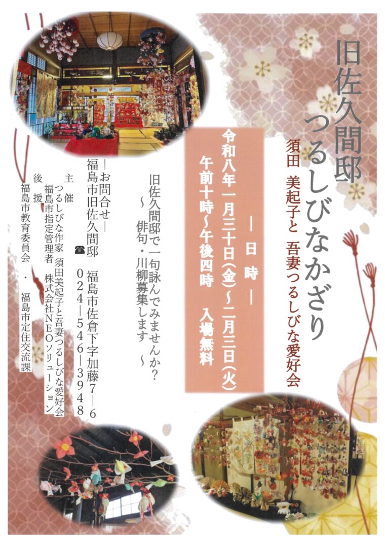 旧佐久間邸でつるしびな作家・須田美紀子さんと吾妻つるしびな愛好会がつるしびな飾りを行います。旧家を彩る雛人形とつるし雛をお楽しみください。俳句・川柳の募集も行います。旧佐久間邸で一句詠んでみませんか?