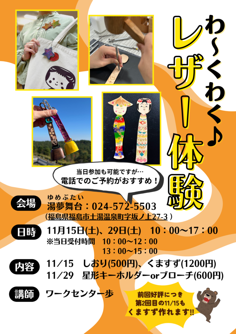 土湯温泉の湯夢舞台(ゆめぶたい)で就労継続支援B型事業所のワークセンター歩による、レザー製品づくりのワークショップが開催されます。しおりや熊鈴、キーホルダー、ブローチなど、皮革を加工して自分だけのオリジナル商品を作ってみましょう。