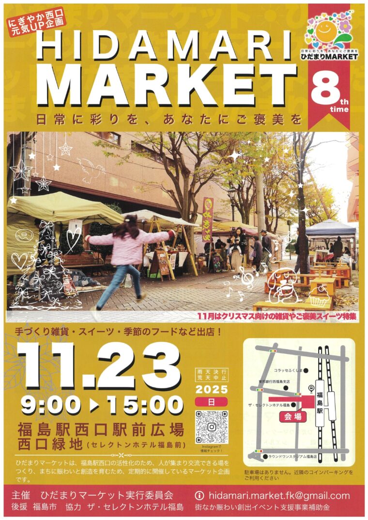 福島駅西口活性化あのため、定期的に開催しているマーケットです。手づくり雑貨・スイーツ・季節のフードが40店出店します。11月はクリスマス向けの雑貨やご褒美スイーツが登場!和太鼓演奏やマジックショーも開催します。