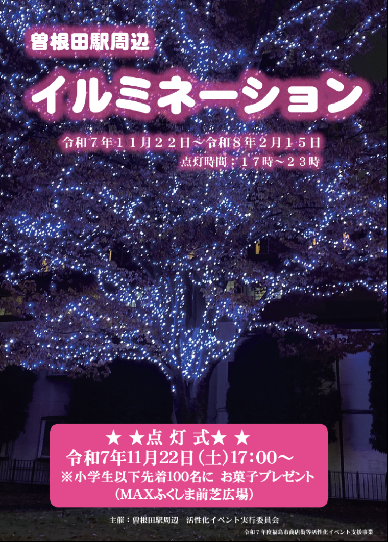 福島交通飯坂線曽根田駅・MAXふくしま周辺にイルミネーションが灯ります。22日の点灯式では小学生以下の先着100名様にお菓子をプレゼントします。