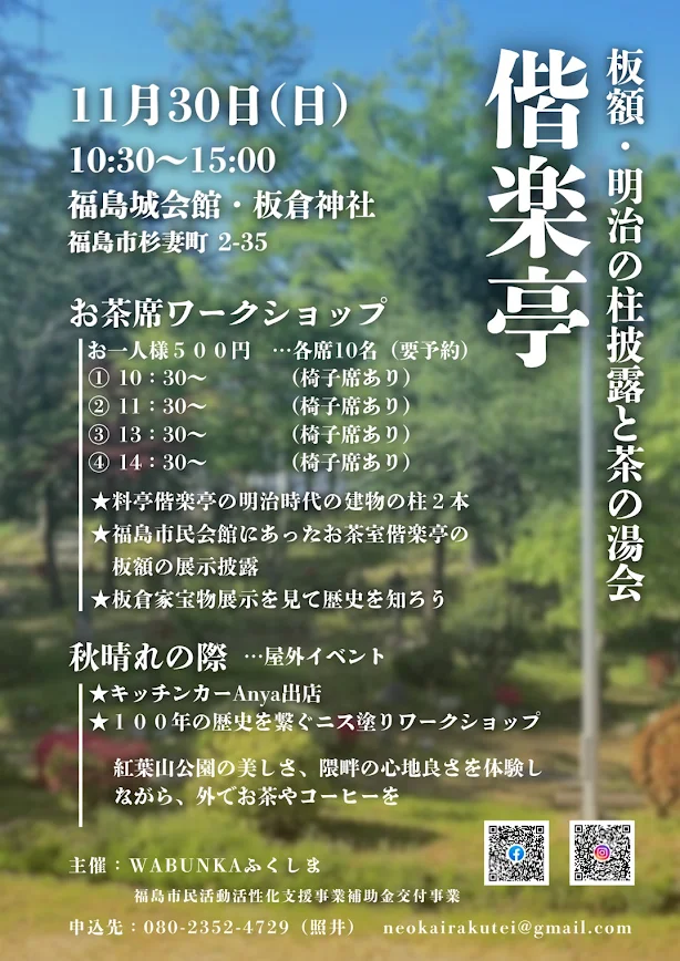 1908(明治41)年から紅葉山公園内(福島県庁東側)にあった料亭「偕楽亭」。福島市民会館に移築されましたが、惜しまれながらも解体されてしまいました。その偕楽亭の、明治期の柱と板額のお披露目会と茶の湯ワークショップを開催します。お抹茶ワークショップは、予約制です。