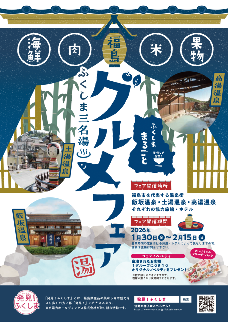 福島市を代表する3つの温泉地【飯坂温泉・土湯温泉・高湯温泉】でグルメフェアを開催します。期間中は、各温泉地の協力旅館・ホテルにて、海鮮・お肉・お米・果物など、“味の宝庫ふくしま”をまるごと堪能できる特別な宿泊プランをご用意しました。