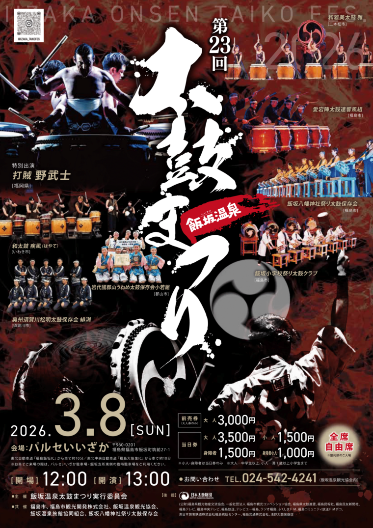 飯坂町が誇る郷土芸能「飯坂太鼓」をはじめ、県内外の太鼓団体が一堂に会して大規模な共演を行います。和太鼓の魅力をご堪能ください。