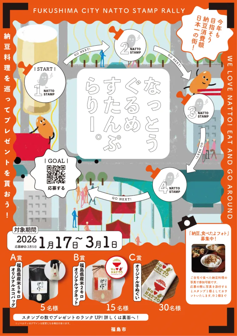 福島市は1世帯当たりの納豆消費額が直近10年間で7度、「日本一」に輝いています。福島市ならではの納豆の魅力を身近に触れていただくため、「納豆のまち福島」を巡るグルメスタンプラリーを開催します。
