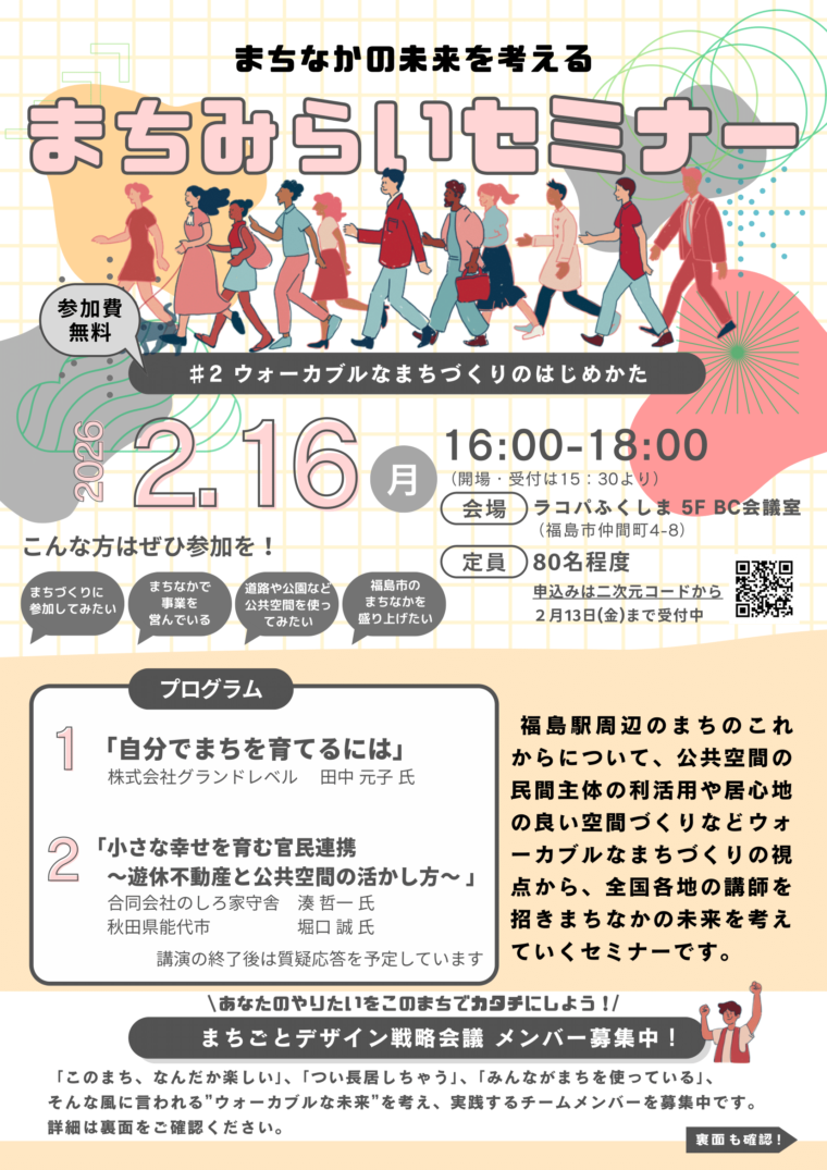 福島駅周辺のまちのこれからについて、市民一人ひとりがまちづくりへの関わり方を考え、ウォーカブル(歩きやすい)なまちづくりの機運を高めるとともに、他市事例を学ぶためのセミナーを開催します。※2/13(金)までにお申込みください。
