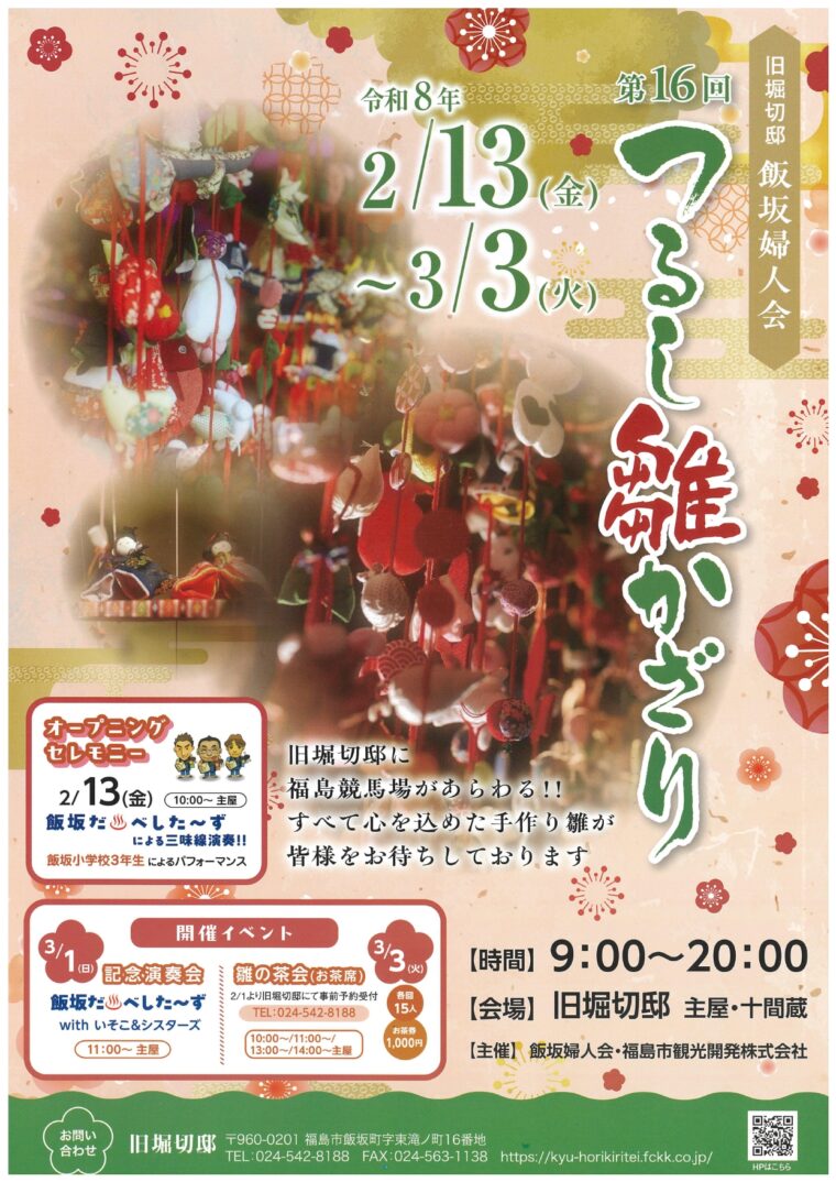 旧堀切邸オープンの年から途切れることなく続いてきたつるし雛かざりも今年で第16回目を迎えます。飯坂婦人会の会員がひと針ひと針心を込めて作り上げたつるし雛の数はおよそ8,000個ございます。