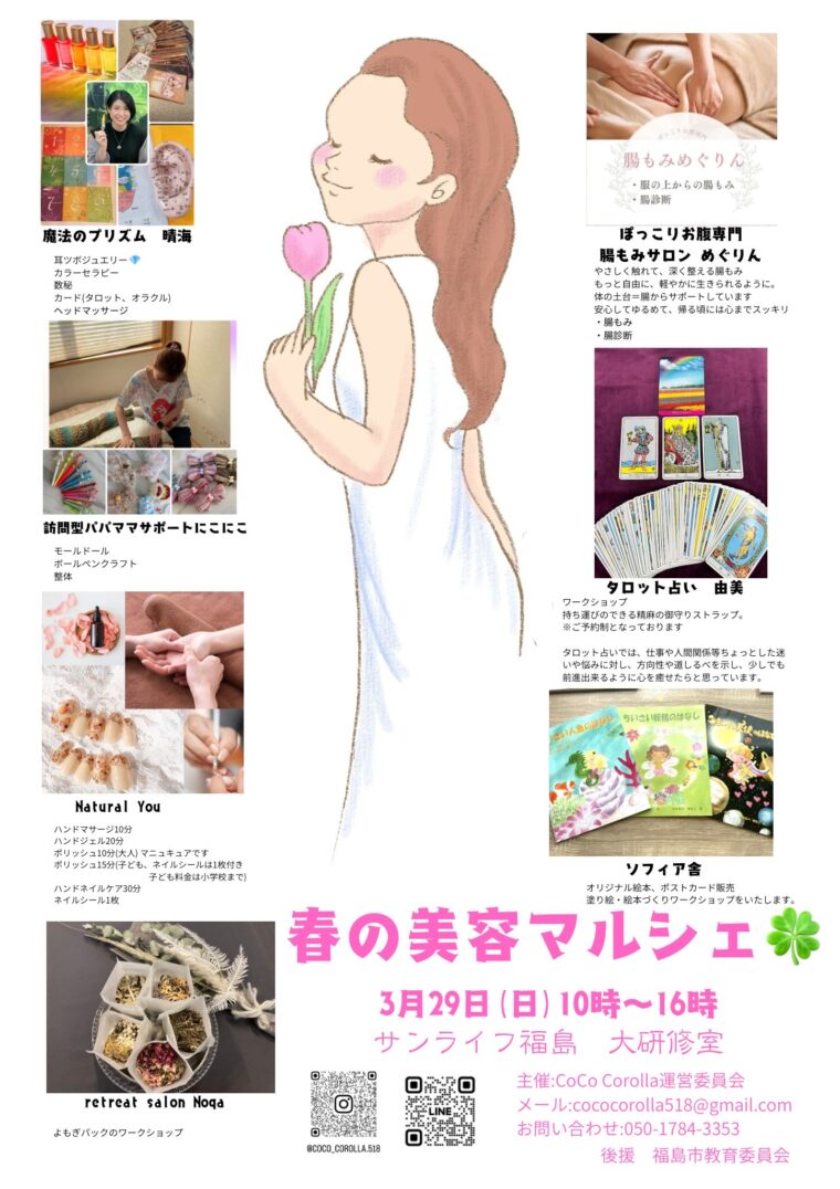 サンライフ福島に、マッサージ・占い・ネイル・腸活マッサージなど癒しのブースが集結します。ハンドメイドを楽しみたい方には、絵本ワークショップ、よもぎパックのワークショップもあります。