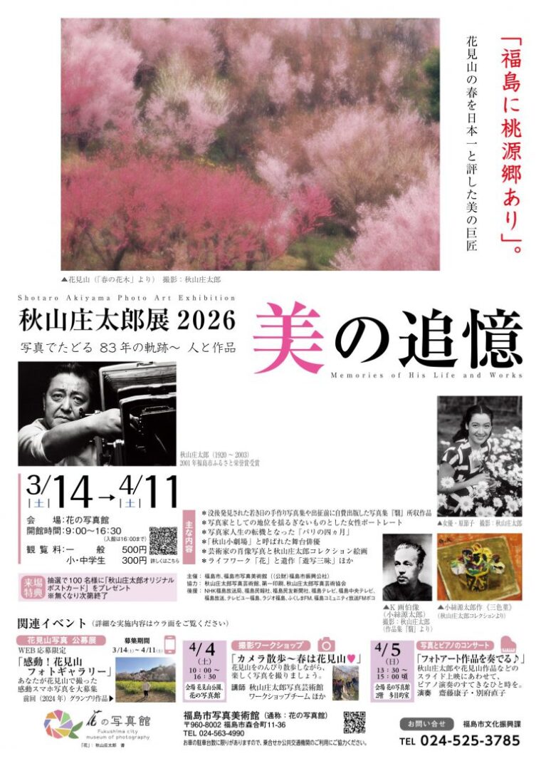 「福島に桃源郷あり」と花見山を全国に紹介した写真家の故秋山庄太郎さん。没後発見された初期作品から、ポートレート、ライフワーク「花」や最晩年「遊写三味」に至るまで、さまざまな作品や資料を通して写真家人生の軌跡をたどります。