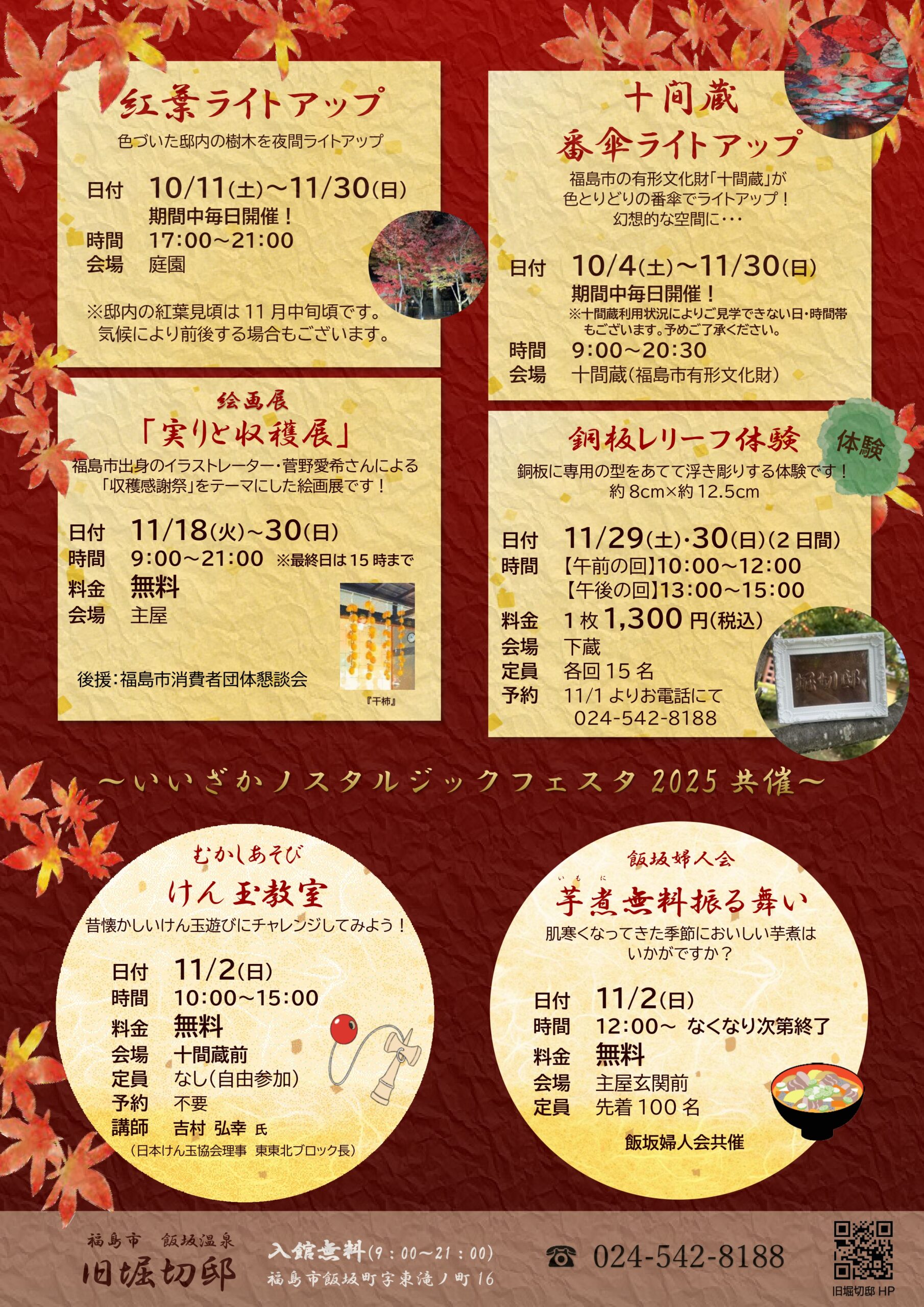 毎年恒例人気イベント「旧堀切邸秋まつり」を2025年も開催。十間蔵での番傘ライトアップや邸内の紅葉ライトアップなど、フォトジェニックな空間をお楽しみいただけます! ■十間蔵×番傘ライトアップ ■紅葉ライトアップ ■絵画展『実りと収穫展』 ■銅板レリーフ体験 ■けん玉教室 ■芋煮無料振る舞い |
