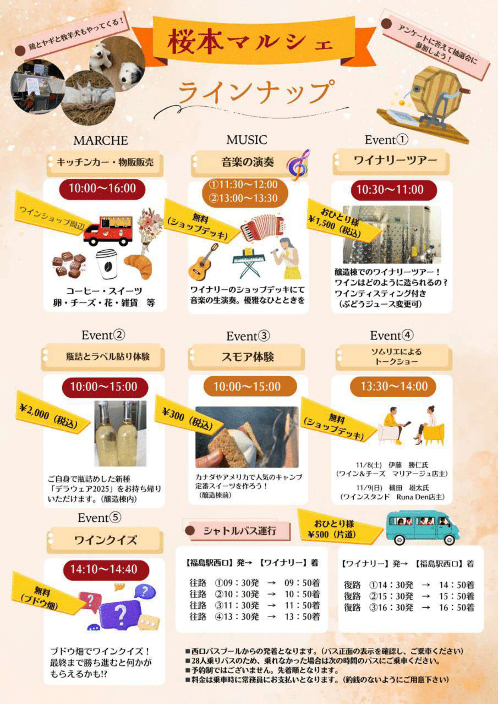 福島市を一望できるワイナリーでマルシェと音楽を楽しむ2日間。ワイナリーツアーやワイン瓶詰とラベル貼り体験などの有料イベントのほか、ブドウ畑で行われるワインクイズやソムリエによるトークショーなど無料イベントもございます。 福島駅西口からワイナリーまでシャトルバスが運行されます。是非ご利用ください。 ■往路【福島駅西口】発→【ワイナリー】着 ■復路【ワイナリー】発→【福島駅西口】着 |