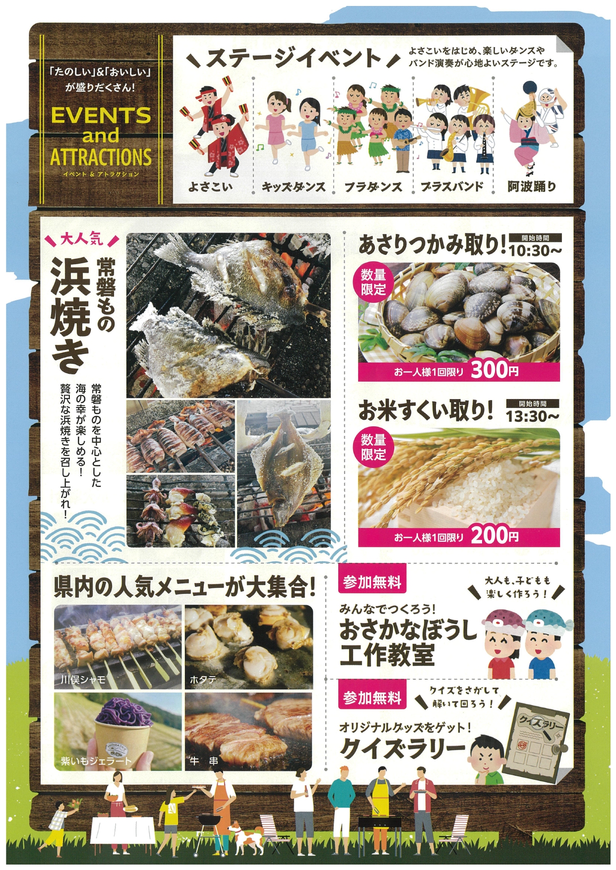 道の駅ふくしまでBBQしませんか?手ぶらでOK、片付け不要です。 また、会期中にはよさこい、キッズダンス、フラダンス、ブラスバンド、阿波踊りなどのステージイベントや、あさりつかみ取り・お米すくい取り(有料・数量限定)や、常磐ものの浜焼き、工作教室(参加無料)にクイズラリー(参加無料)など、たのしいイベント盛りだくさん!キッチンカーも登場予定です。 |