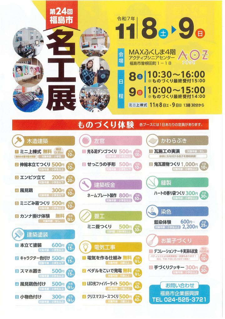 福島市最高水準の技を持つ「市技巧功労者表彰」の受賞者で構成された団体「福島市名工会」が、後進の育成と技術者の技能向上、産業の振興に寄与するために開催しているイベントです。 ミニ畳作りや鬼瓦置物つくり、塗装体験、手づくりクッキーなど匠の技を間近で学びながら体験できます。ぜひファミリーでご来場ください。 |