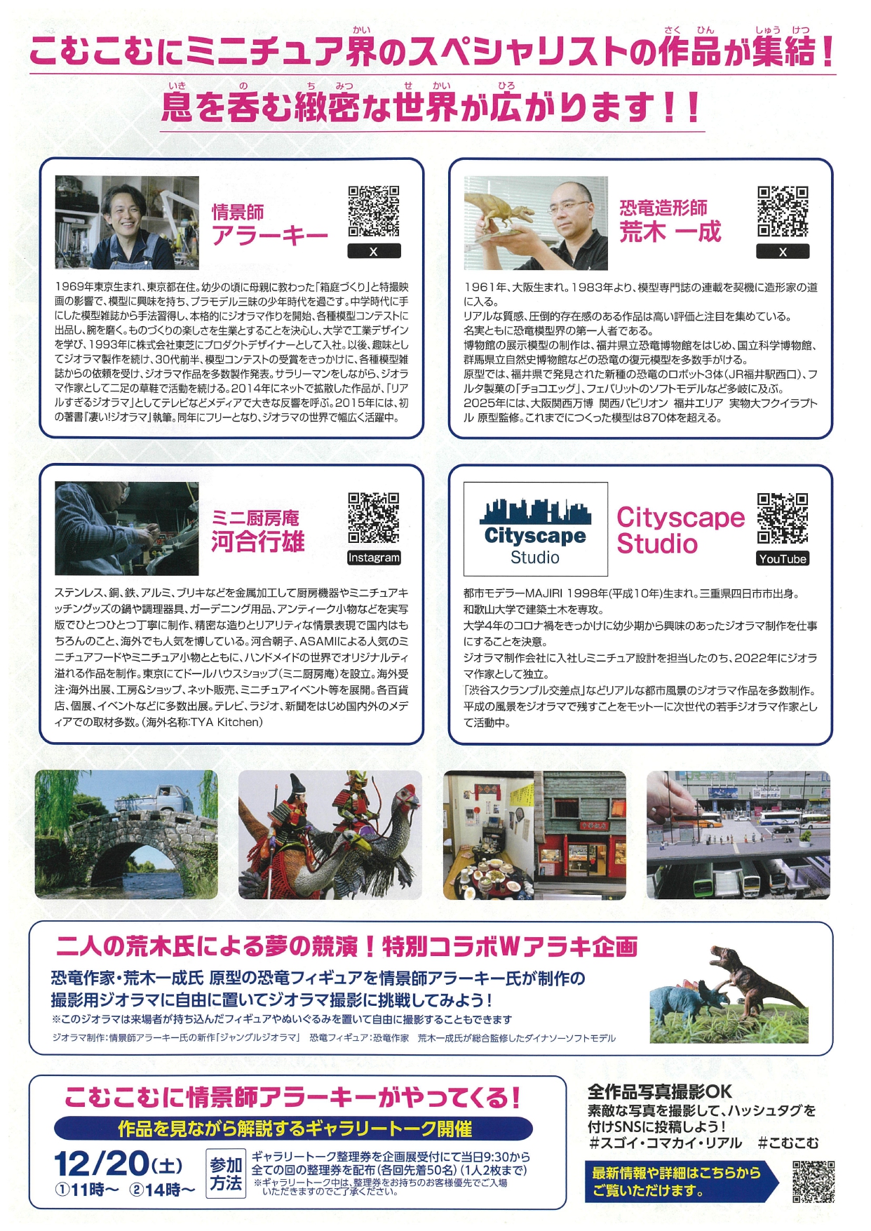 | 備考 | 作品を見ながら解説するギャラリートーク開催 「こむこむに情景師アラーキー氏がやってくる!」 12/20(土)①11:00~②14:00~ 【参加方法】整理券を企画展受付にて当日9:30から全ての回の整理券を配布します。 ※各回先着50名、1人2枚まで |