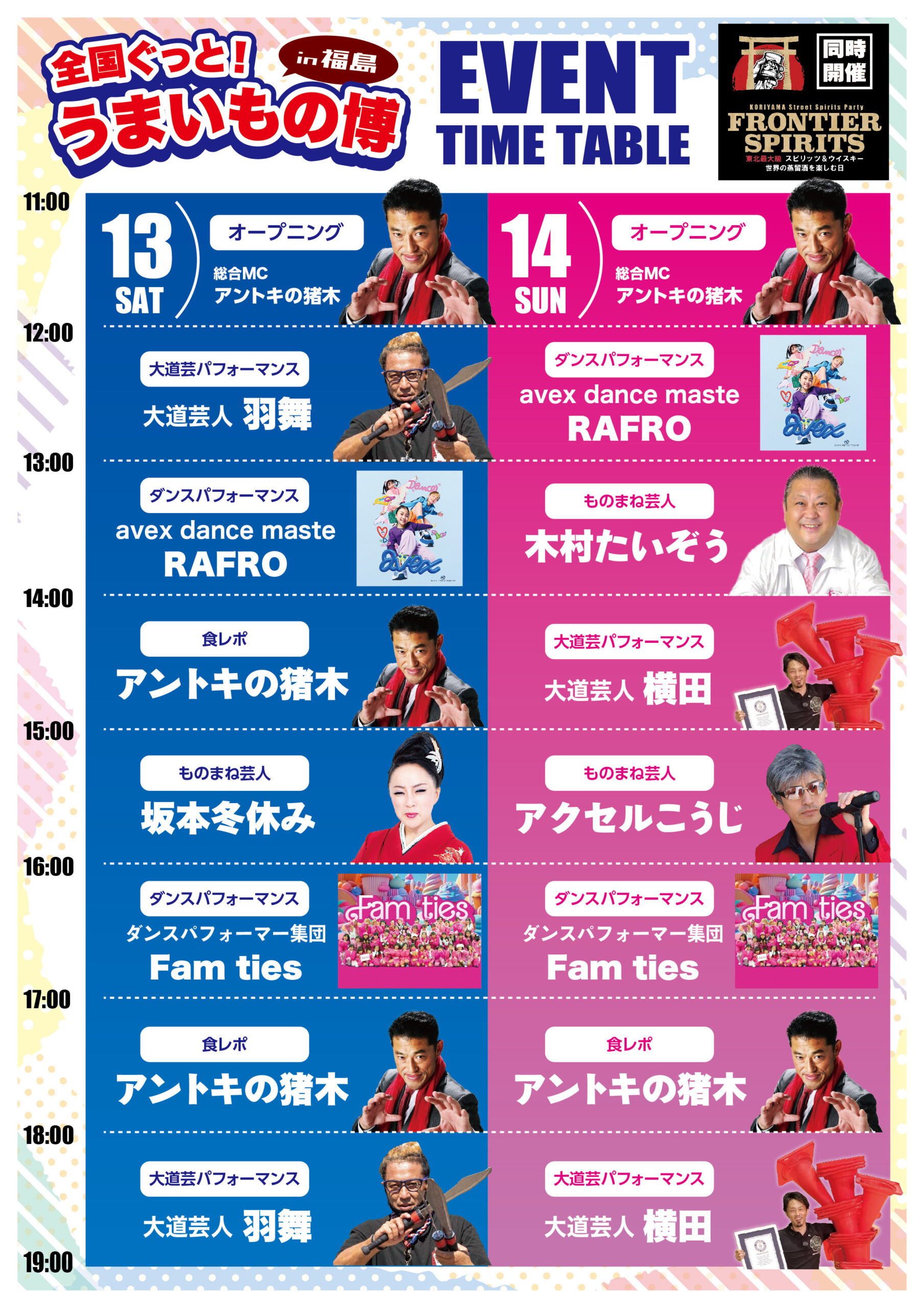 | 内容 | 「全国ぐっと!うまいもの博」が福島県初開催! やきいもモンブラン塩バタークレープや10ウォンパン、熟成だしザンギなど、話題のグルメや定番グルメが全国各地から大集合します。人気ものまねタレントのアントキの猪木やアクセルこうじ、坂本冬休みもやってくる! |