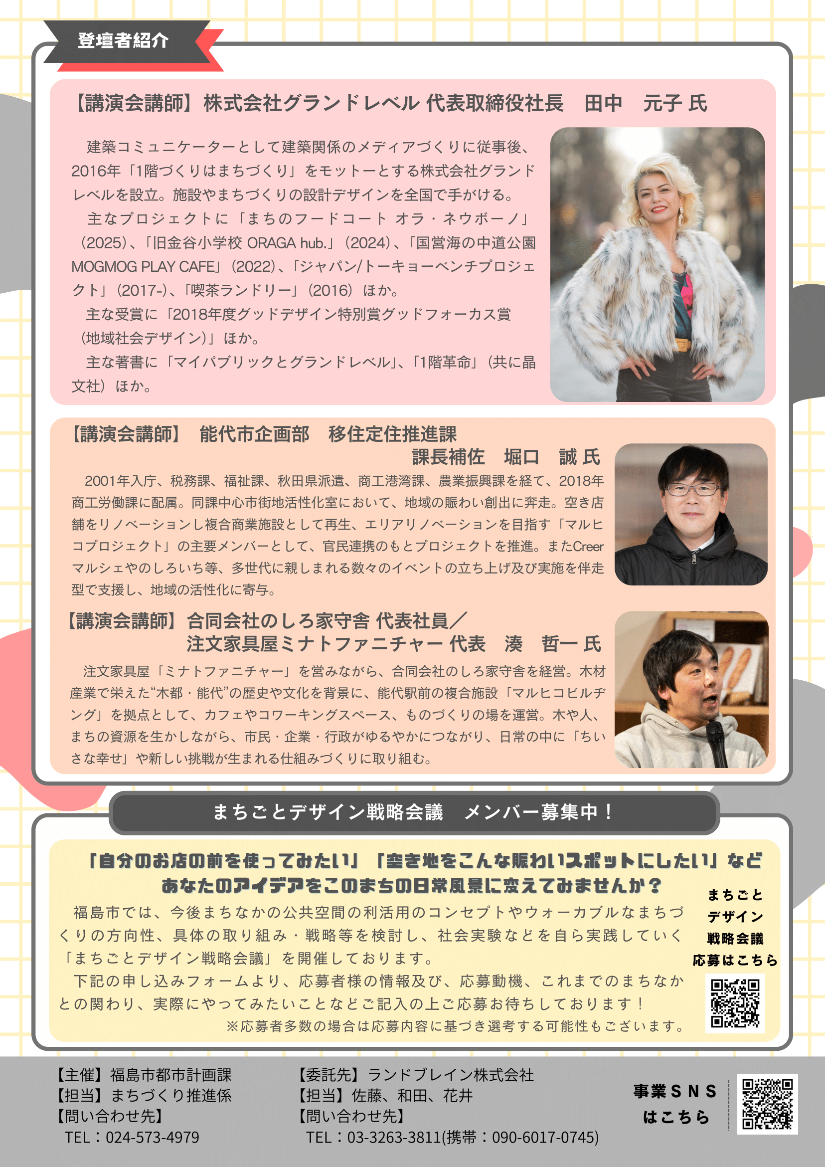 福島駅周辺のまちのこれからについて、市民一人ひとりがまちづくりへの関わり方を考え、ウォーカブル(歩きやすい)なまちづくりの機運を高めるとともに、他市事例を学ぶためのセミナーを開催します。 講演会講師はそれぞれの現場で活躍されている、株式会社グランドレベル 代表取締役社長 田中元子氏、能代市企画部移住定住推進課 課長補佐 堀口誠氏、合同会社のしろ家守舎 代表社員/注文家具屋 ミナトファニチャー 代表 湊哲一氏が登壇します。 |
