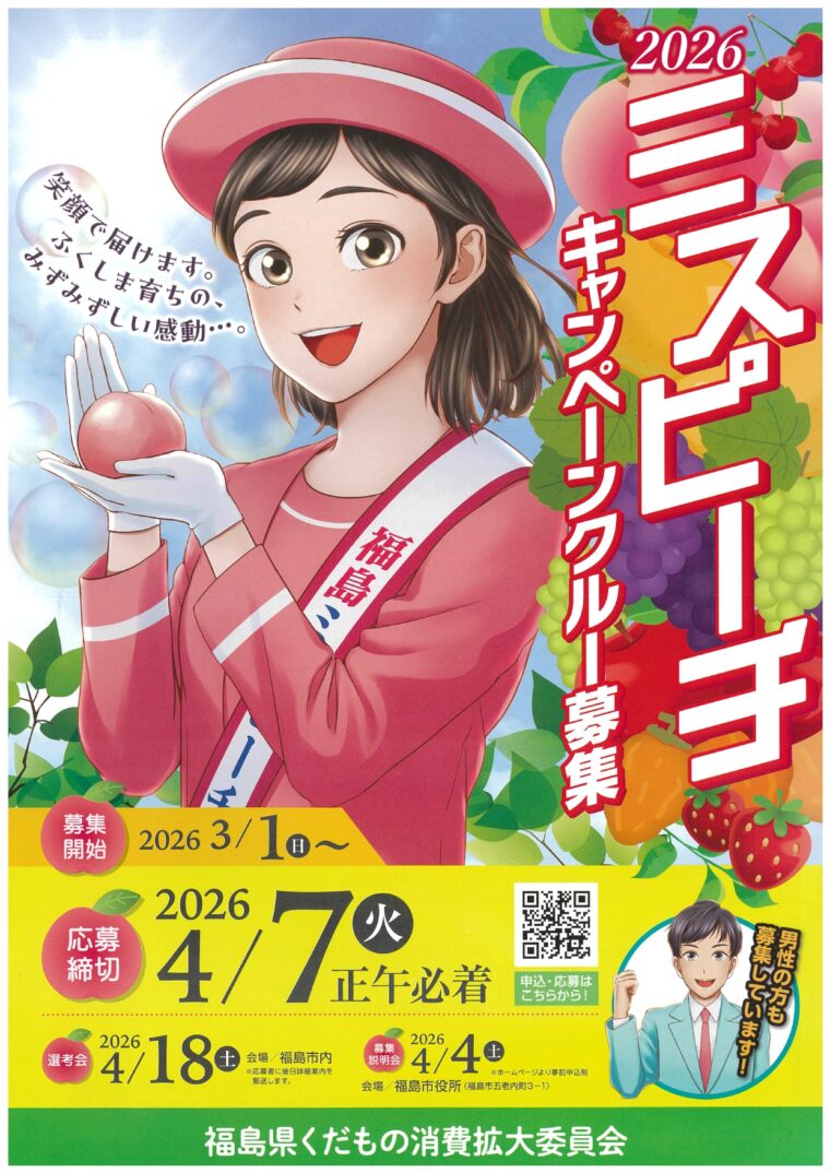 「くだもの王国ふくしま」を全国に発信する「2026ミスピーチキャンペーンクルー」を募集します。 クルーに選ばれた方には、福島のくだものの品質の高さと安全・安心・生産者の愛情を、全国の市場・量販店・各種イベントなどでPRしていただきます。 |