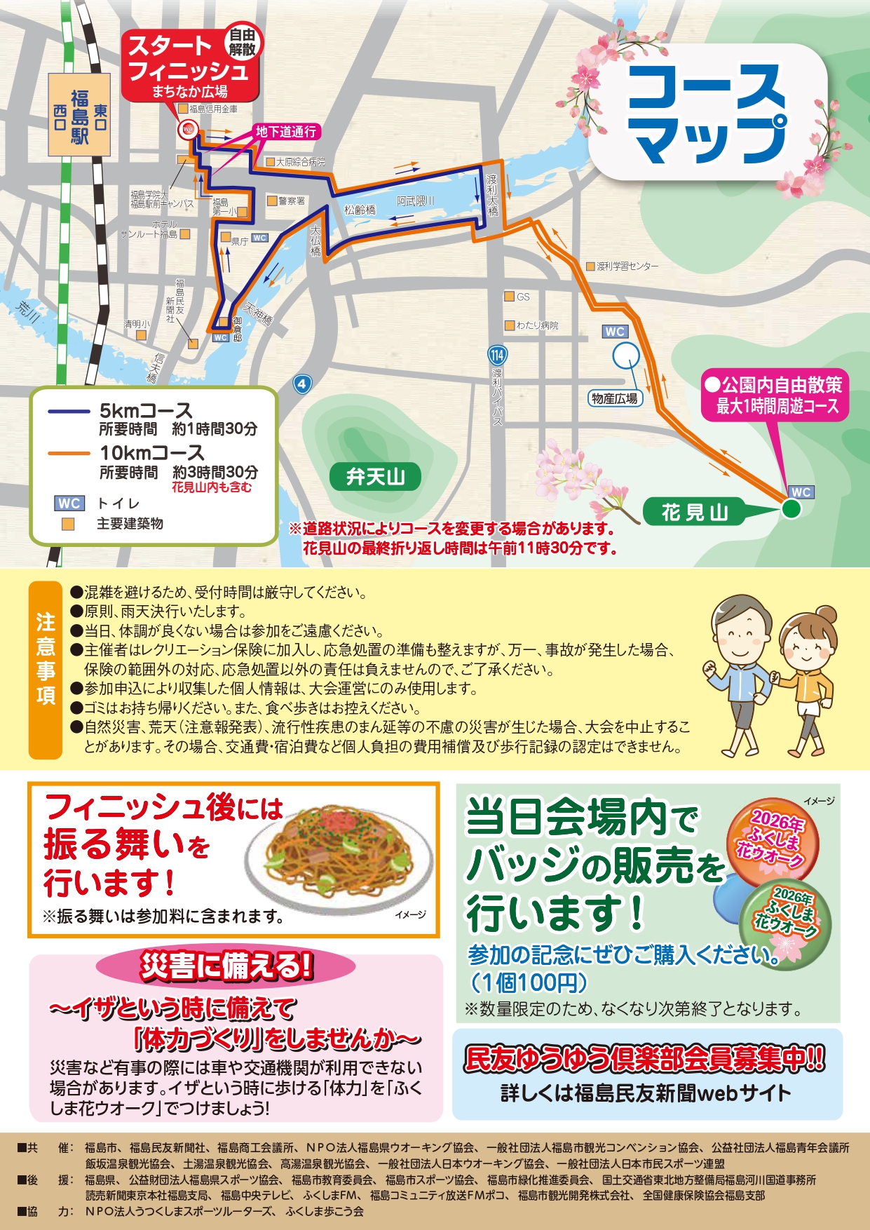 | 内容 | 福島市まちなか広場をスタート・ゴールに、春の花々を楽しめる「花見山」や、阿武隈川サイクリングロード、「御倉邸」などの桜の名所を巡るウオーキング大会です。 |