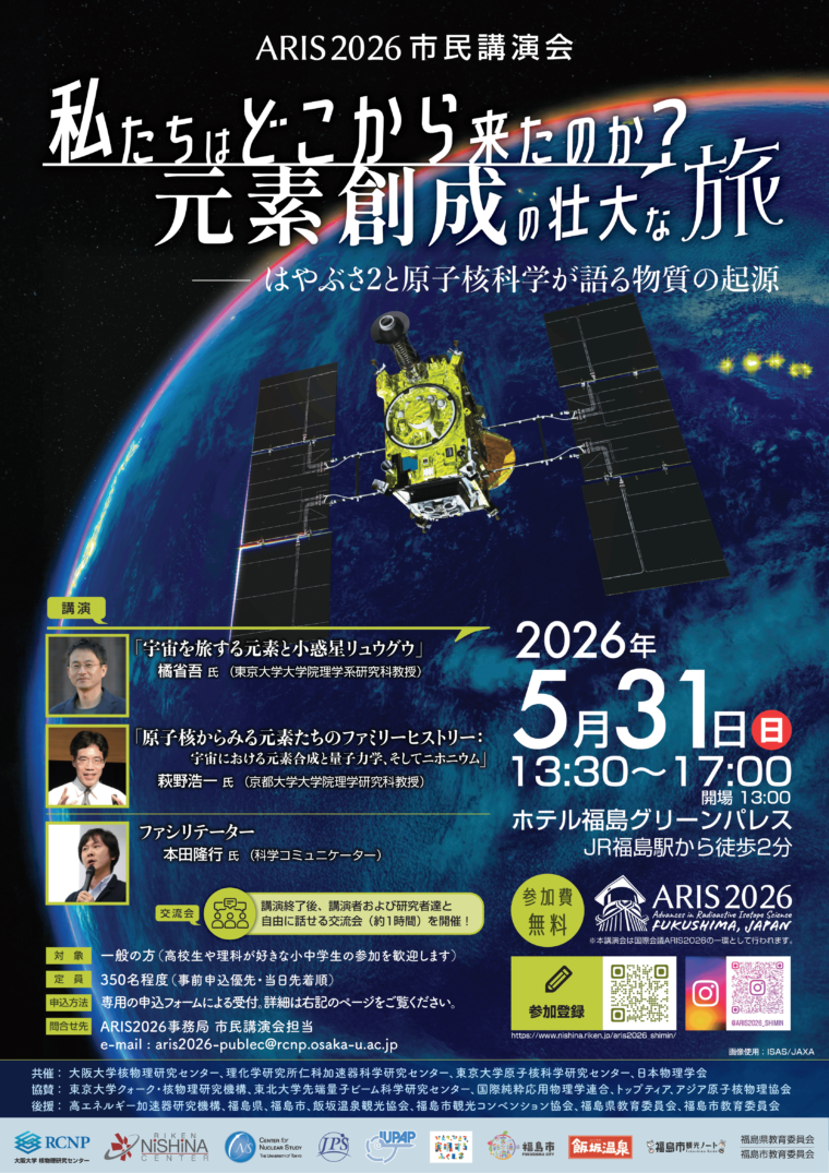 | 問合せ | ARIS2026事務局 市民講演会担当 mail:aris2026-publec[at]rcnp.osaka-u.ac.jp ([at]は@に置き換えてください。) |