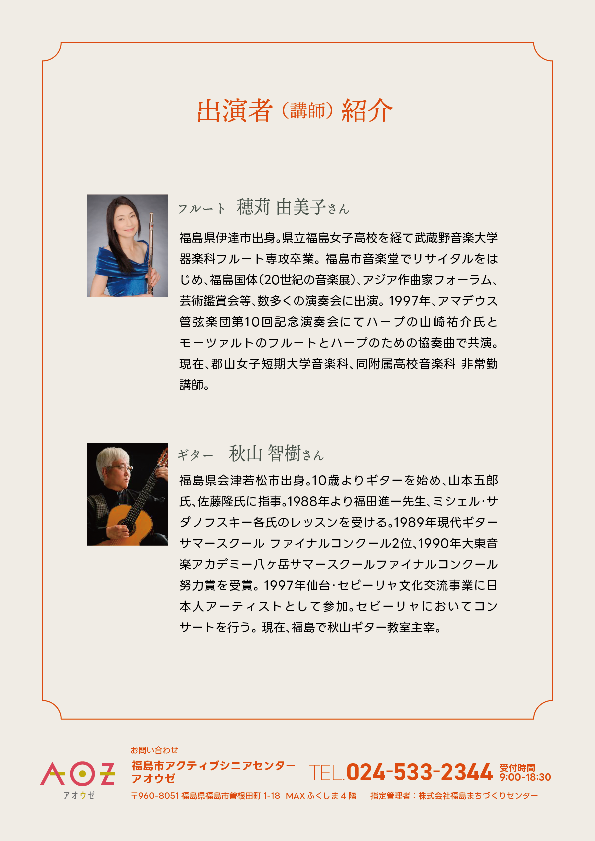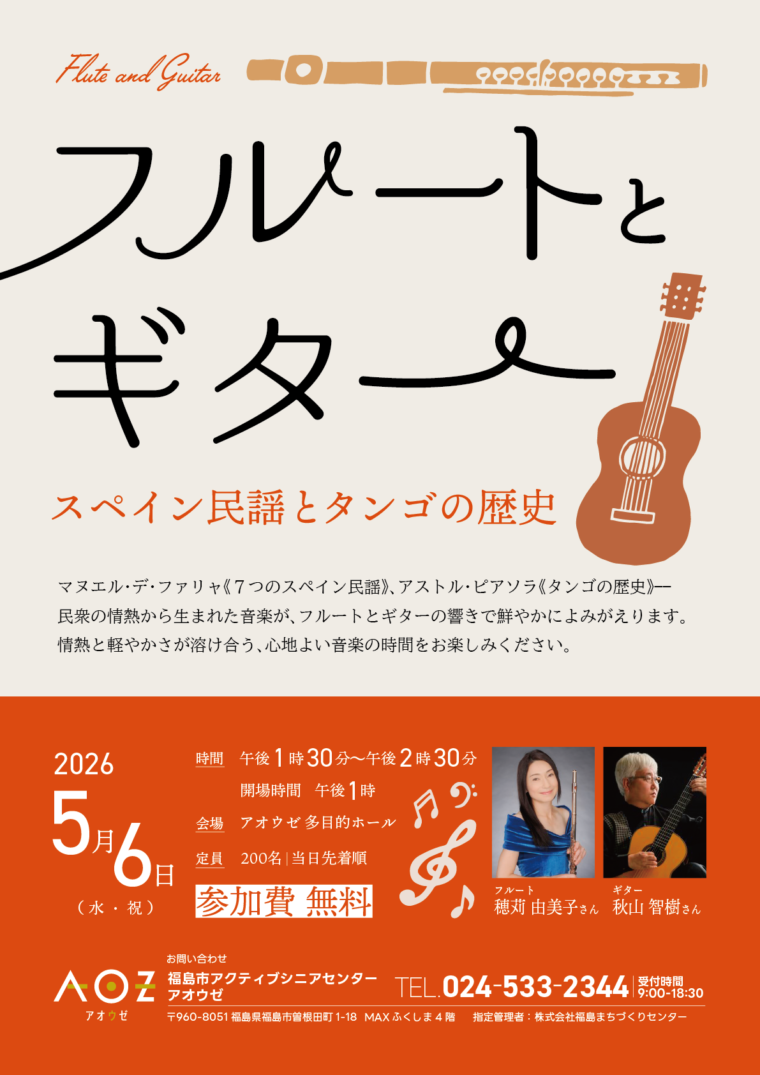 | 問合せ | 福島市アクティブシニアセンター・アオウゼ TEL:024-533-2344(受付時間 9:00〜18:30) |