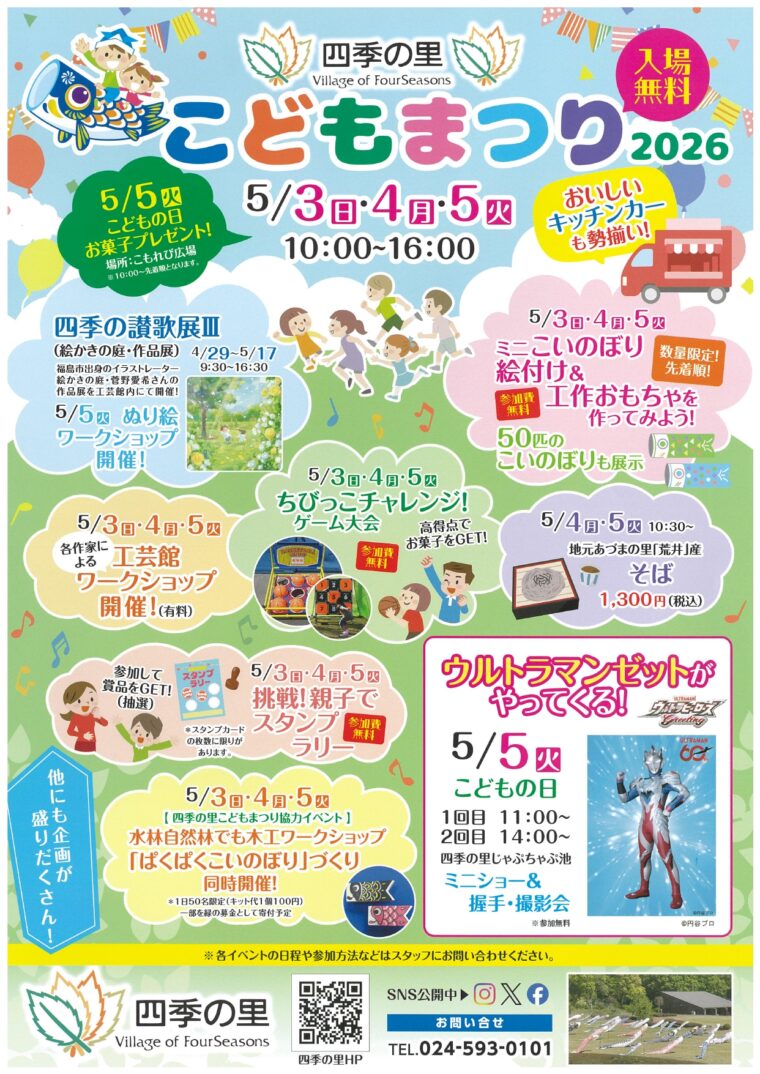 ゴールデンウィーク期間中、四季の里では「こどもまつり2026」を開催いたします! お子さま向けの体験やワークショップ、ゲーム大会など、盛りだくさんの内容をご用意しております。 【主な内容】 また、5月5日(こどもの日)には、ウルトラマンゼットによるミニショー・握手・撮影会を開催予定です。さらに、「四季の讃歌展Ⅲ」も同時開催しておりますので、あわせてお楽しみください。 |
