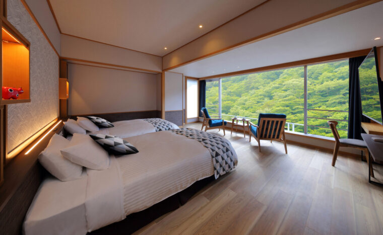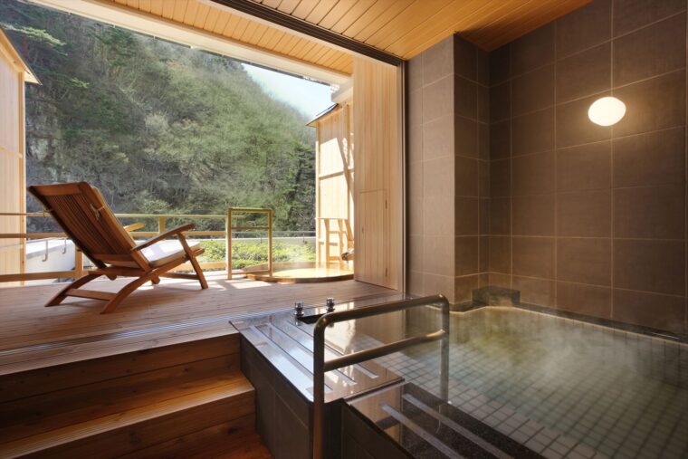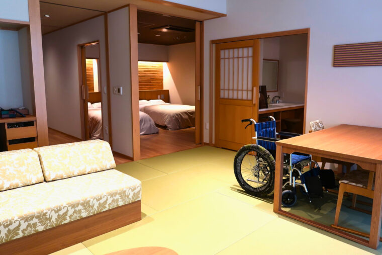 バリアフリーに特化した最高級客室「紫水亭 ユニバーサルスィートルーム」は、お部屋の中の段差を抑えた設計で半露天風呂を備えており、移動の負担を最小限に、プライベートな空間で福島の四季を感じながら源泉を堪能できるのが特徴です。