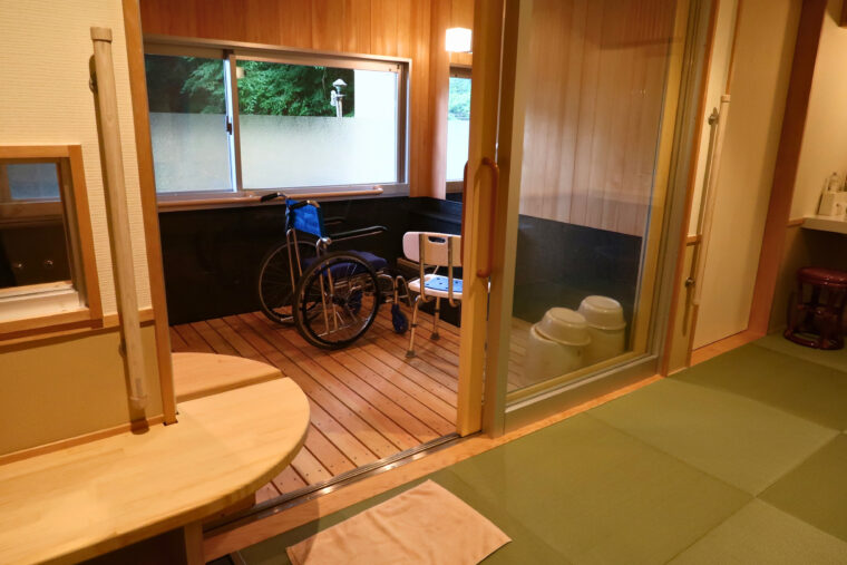 車椅子のままお部屋へ。そしてそのまま、湯煙たなびく半露天の特等席へ。プロの支えがあれば、そこはもう、極上の安らぎ空間です。
