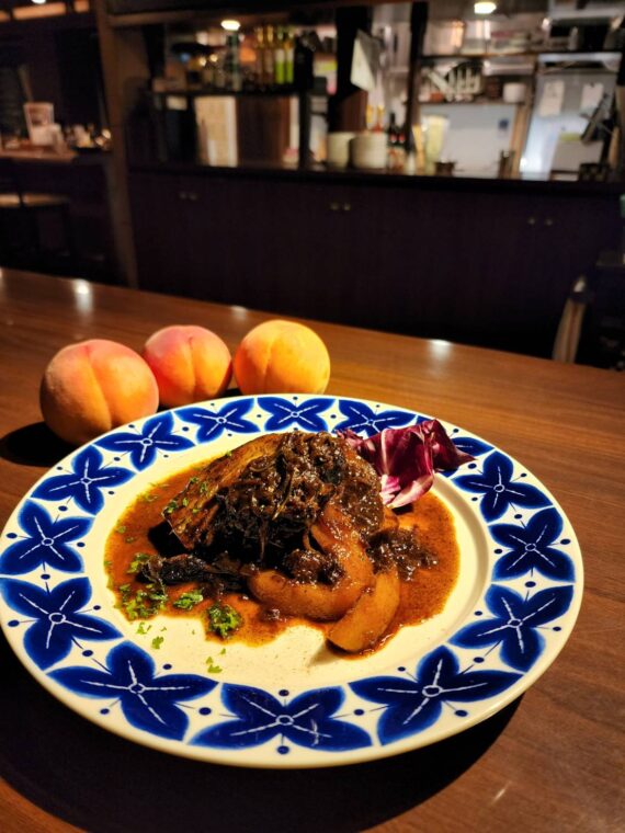 福島県産ブランド豚「あぶくま三元豚」を福島市のりんごとバルサミコ酢、赤ワインでじっくり煮込んだ一品。バルサミコ酢は、加熱すると酸味が甘味に変わり、煮詰める事でまったりとお肉に絡みます。