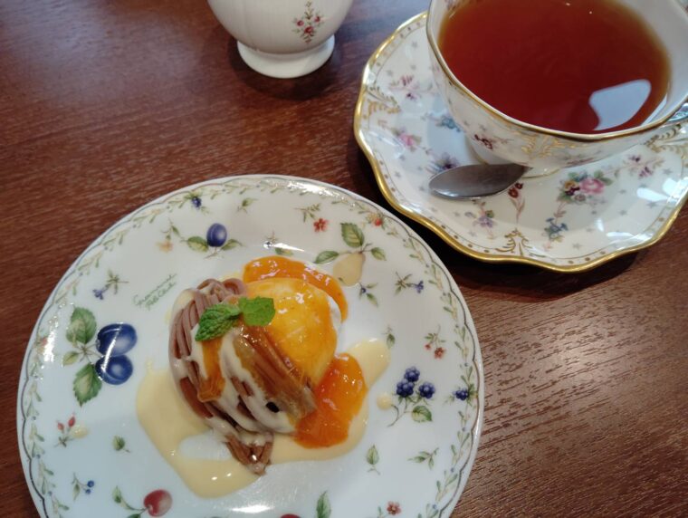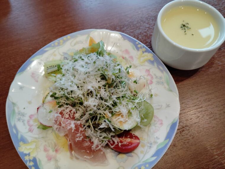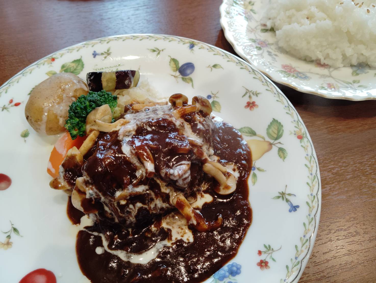 地元農園の野菜やくだものを使用したサラダやデザートは優しい味わい。ハンバーグのデミグラスソースは酸味と塩味のバランスが絶妙で、箸が進みます。
