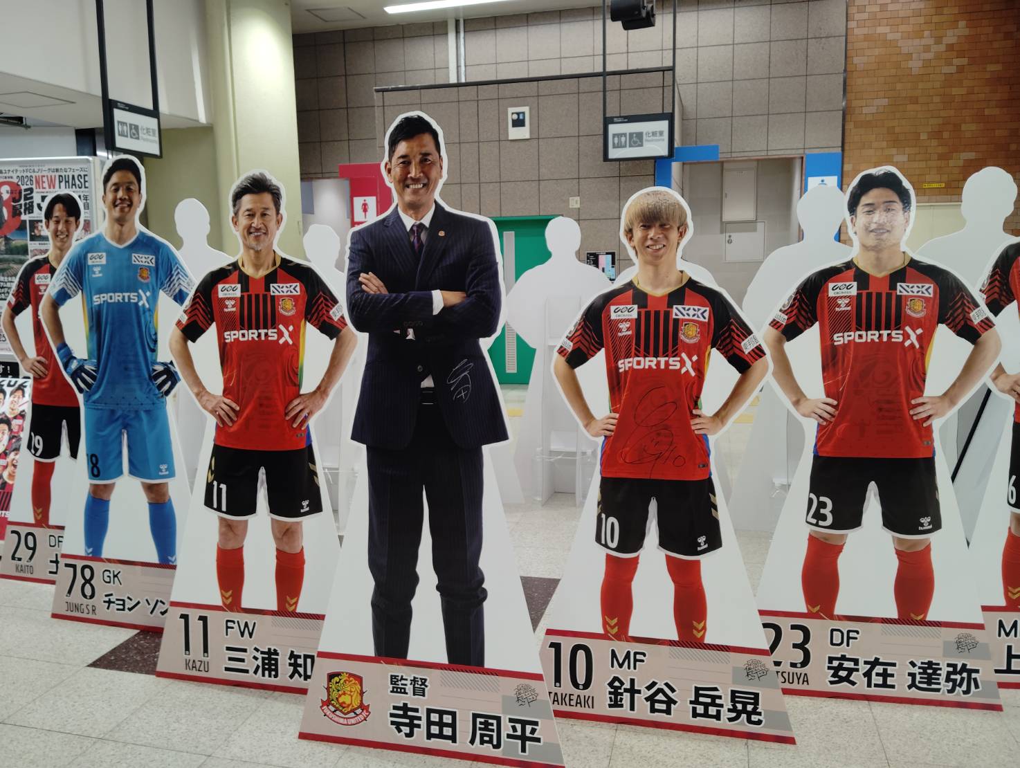 駅の東西連絡通路では、寺田周平監督をはじめ、元日本代表の三浦知良選手や元韓国代表チョン・ソンリョン選手など、今季ホーム開幕戦の先発メンバー計14人の等身大パネルが皆さまをお出迎えします。