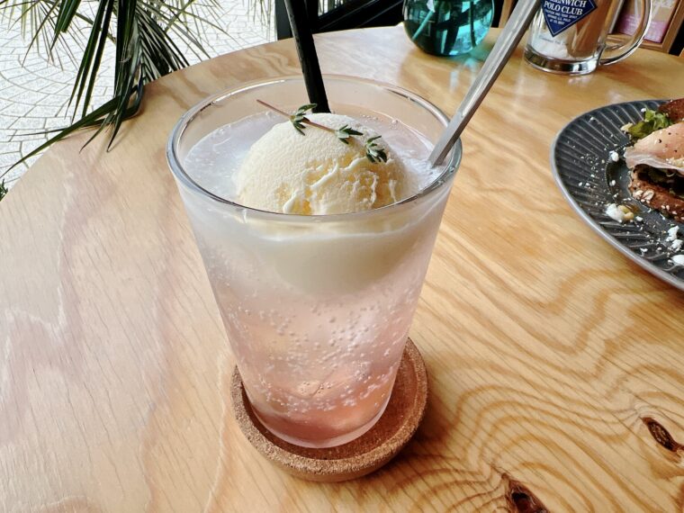 こちらも美しい〜。ロゼ色のクリームソーダに外の光が差し込み、炭酸の泡と共に輝やく姿が見ていて飽きません。が、のんびりしているとアイスが溶けてしまうので、早速実食。
