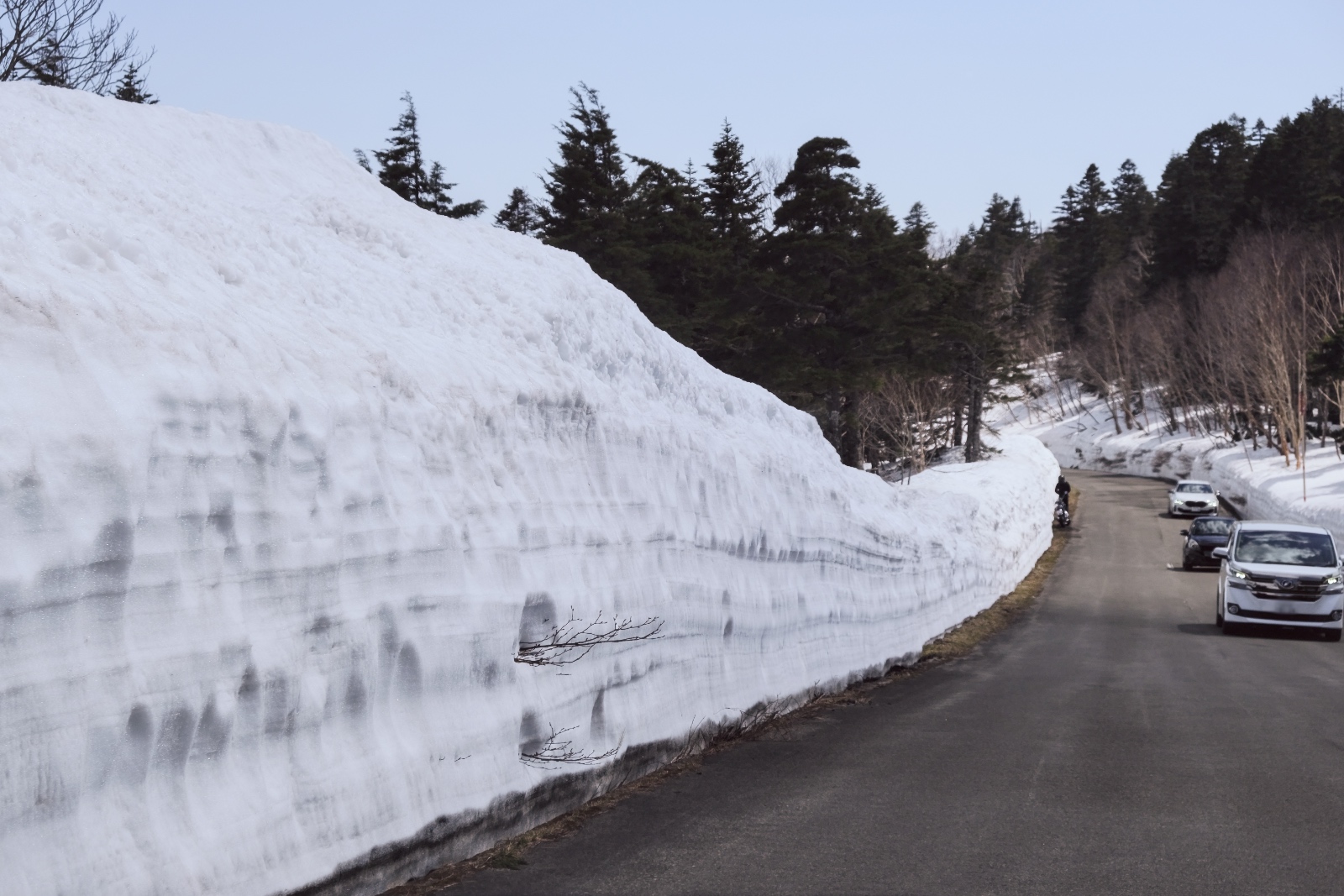 浄土平から再びスカイラインを走り始めると、最高標高地点1,622mの手前あたりから、雪の壁に包まれた「雪の回廊」を見ることができます