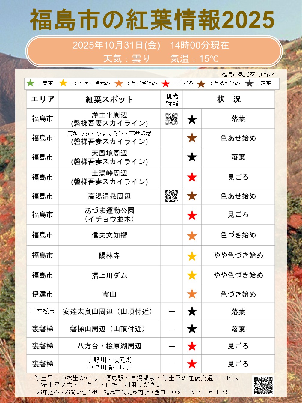 また、福島駅西口から磐梯吾妻スカイライン・浄土平までの直行便「浄土平スカイアクセス」は、2025年11月3日(月・祝)まで運行いたします。是非、ご利用ください。