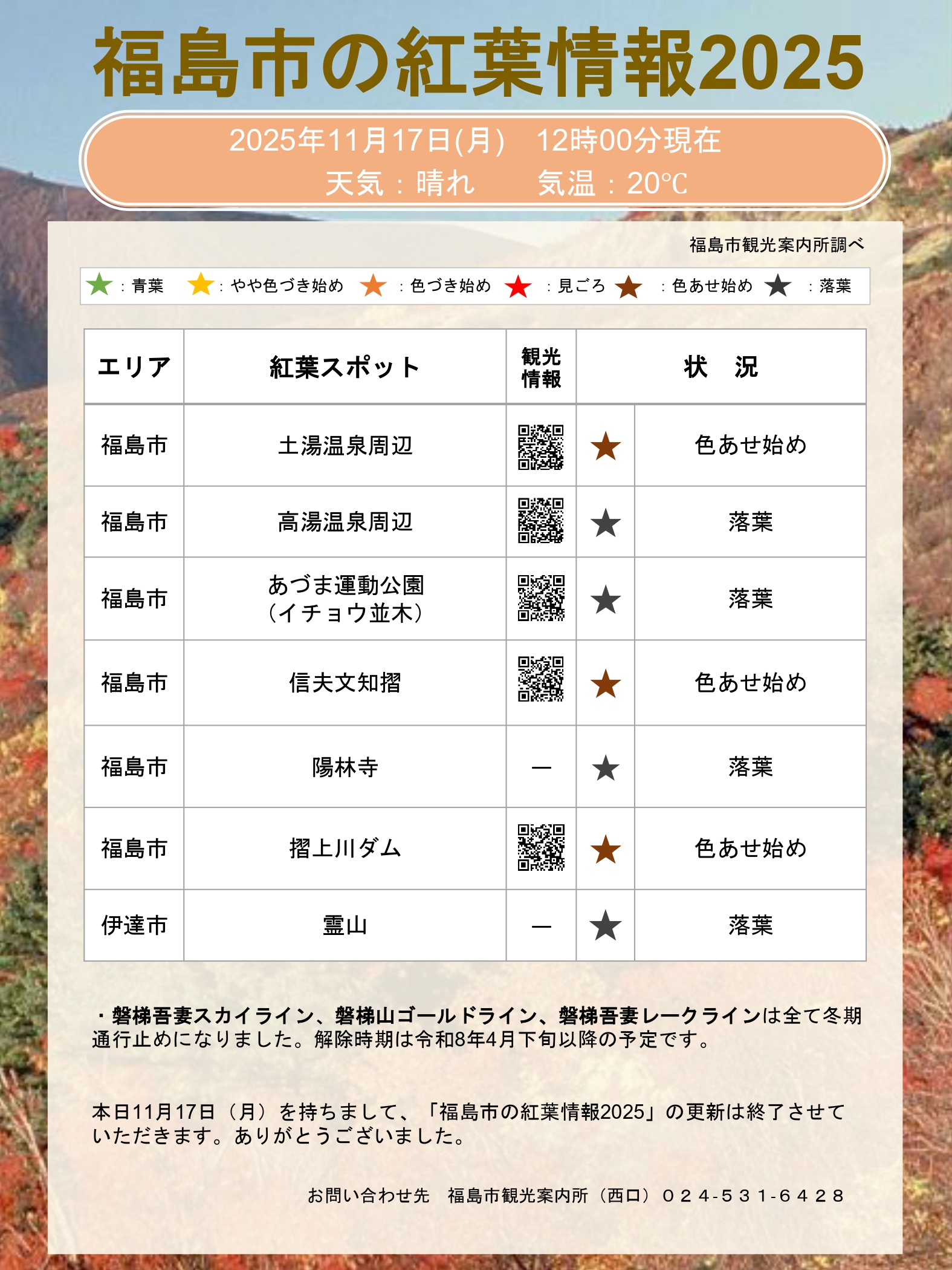 紅葉の見頃が過ぎたため本日をもちまして、「福島市の紅葉情報2025」の更新を終了します。