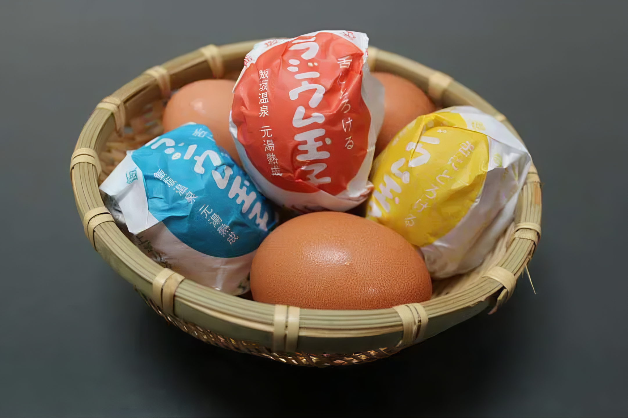 飯坂温泉の名物は、日本で初めて飯坂温泉で確認されたラジウムに由来する飯坂温泉名物「ラジウム玉子」。新鮮な卵を温泉源泉に浸けた温泉卵の元祖といわれています。ほのかな温泉特有の香りに包まれたゼリー状の白身と、とろっとした黄身が特徴。