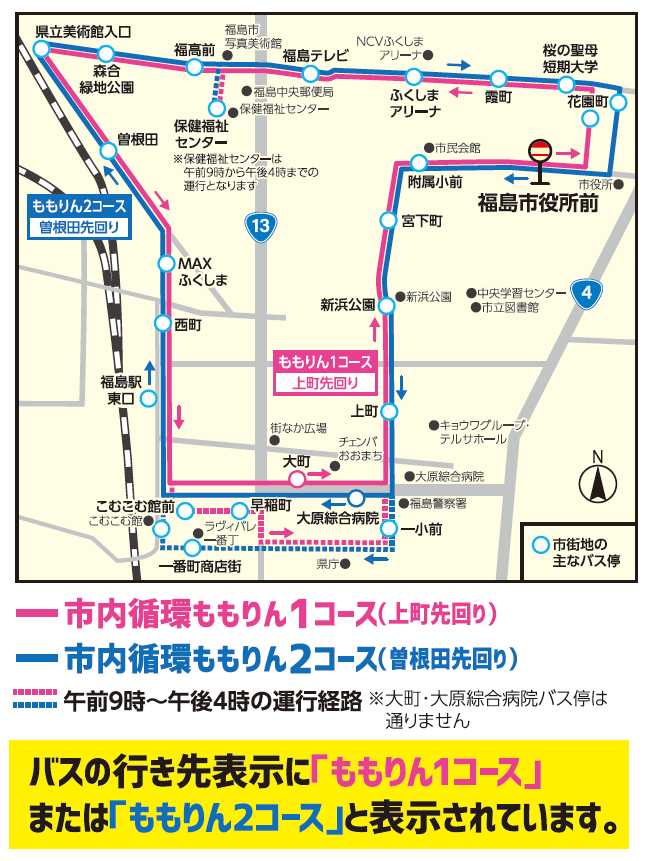 市内循環ももりんバスは、10分から20分間隔で中心市街地を巡っている便利な循環バス。福島県立美術館や子どもの夢を育む施設こむこむ館、福島駅東口などのご利用に便利です。