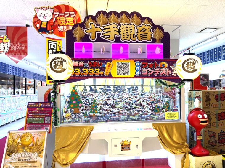 地域最大級のクレーン口数で、獲れる喜びを追求した「爆獲横丁」や、オリジナル10本アームのクレーンゲーム機「十手観音」は、激推しコーナーです。また、10円で遊べる「拾円市場」は、お子様とのクレーンゲーム遊びに最適。