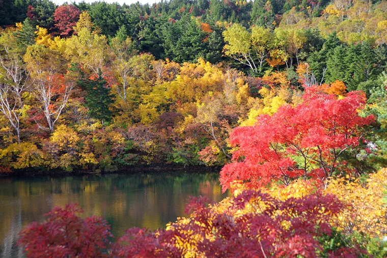 摺上川ダム周辺の紅葉は、ダム湖「茂庭っ湖(もにわっこ)」を取り囲む山々が赤や黄色に色づき、澄んだ秋空と湖面の美しいコントラストが魅力です。