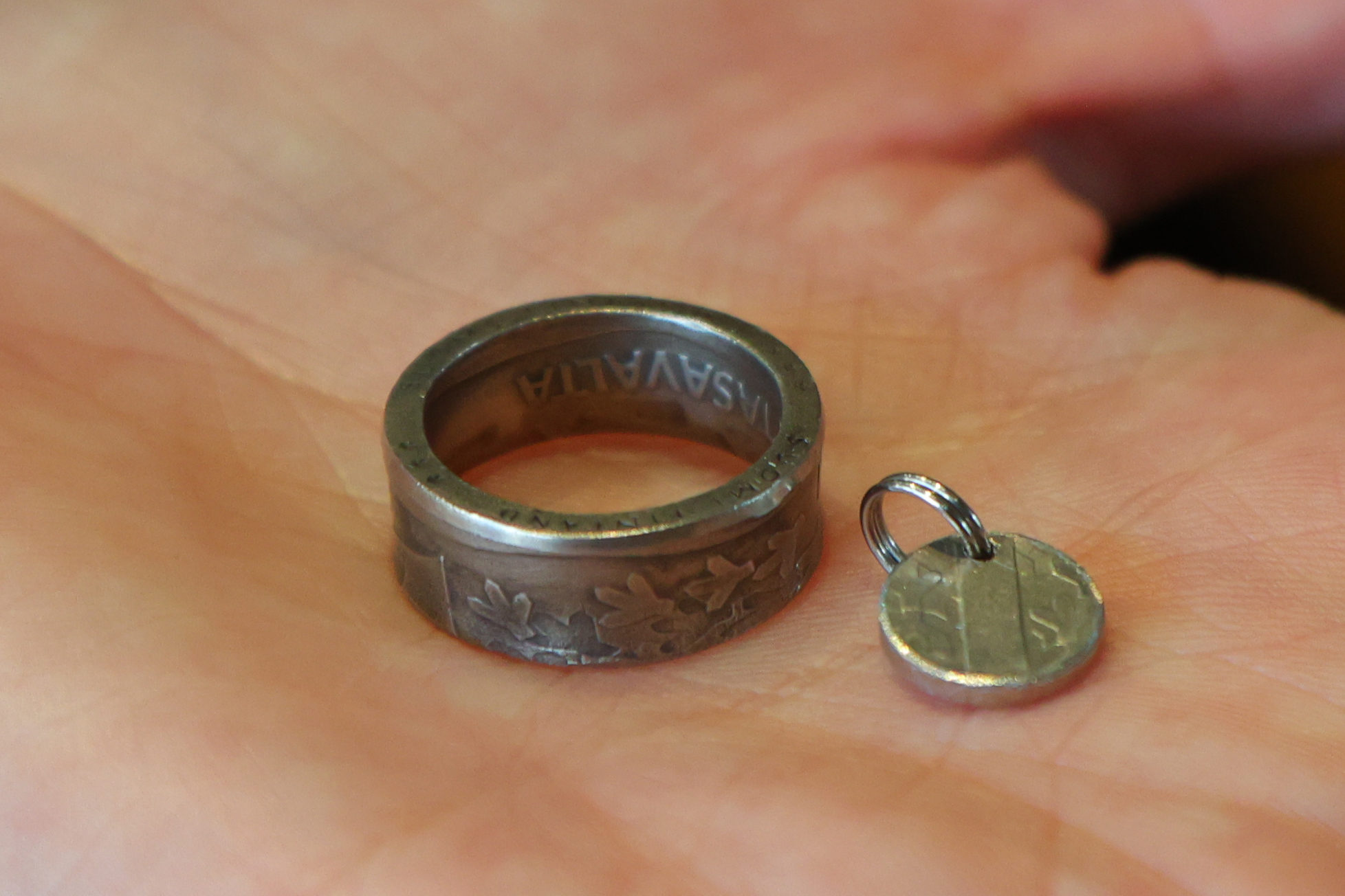 30分ほど作業を進めると、コインのデザインを生かした世界に一つだけのリングが完成! くり抜いた中心部分はネックレスのチャームとして利用できます。