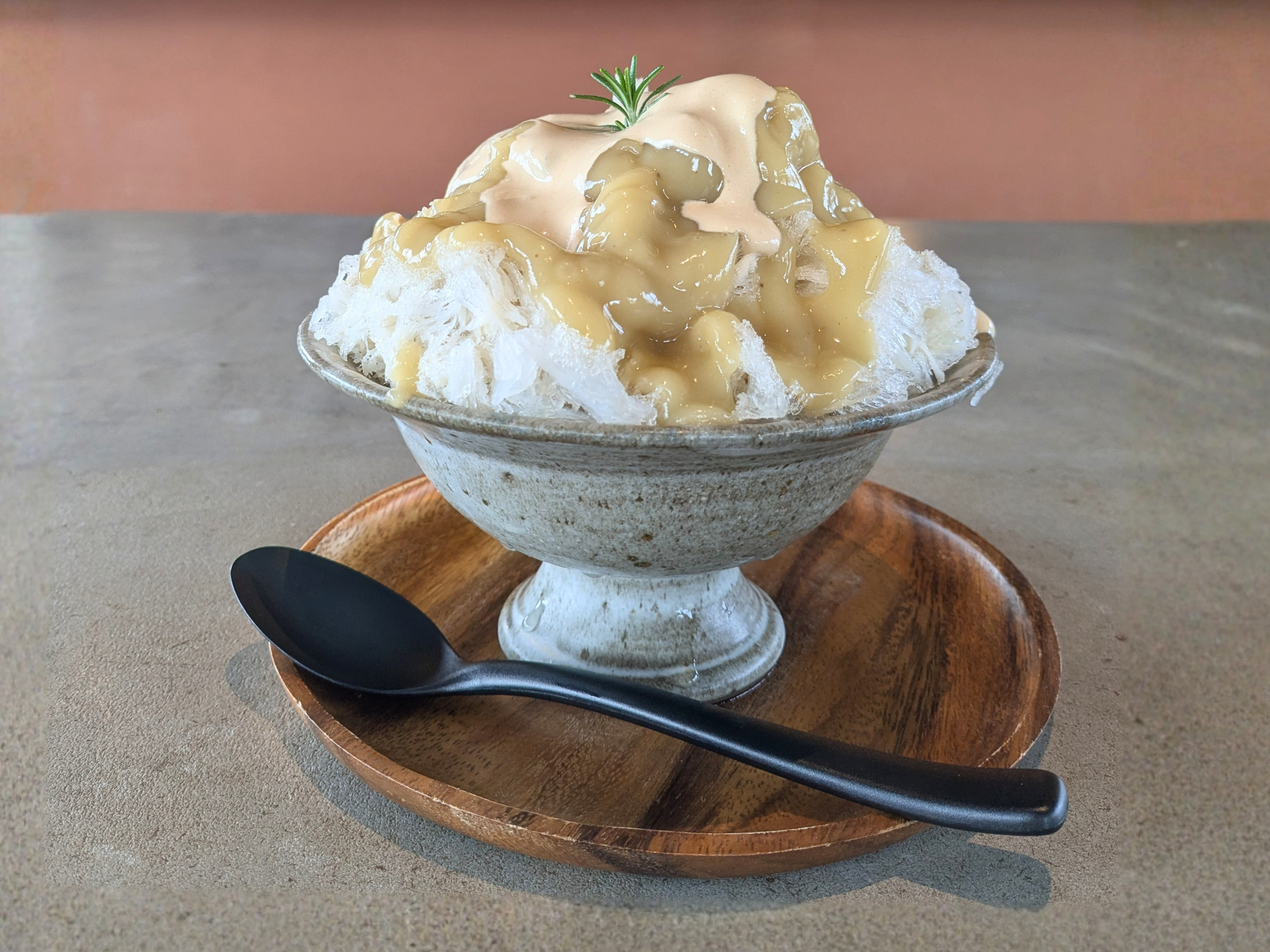 軽やかな口どけの氷の下には、キャラメルパンナコッタ、福島産りんごのコンポート、そしてあんこが隠れています。