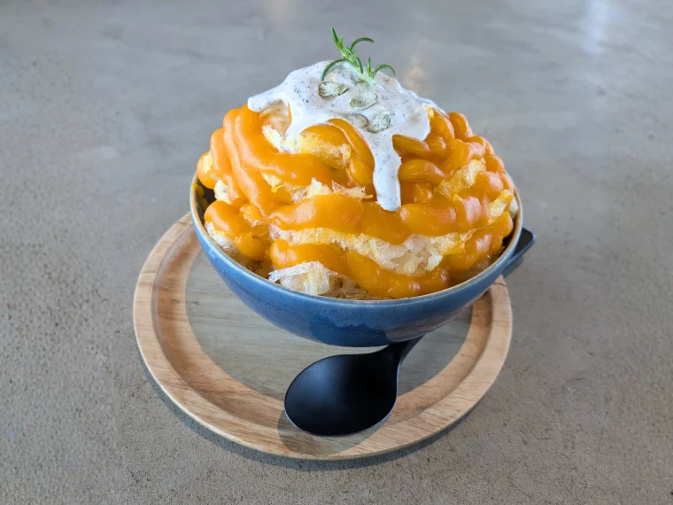 【ピーチホリデイ2025秋】食レポVol.11|「黒胡麻と金山赤かぼちゃのかき氷(福島産りんごのコンポート入り)」by といろ氷店
