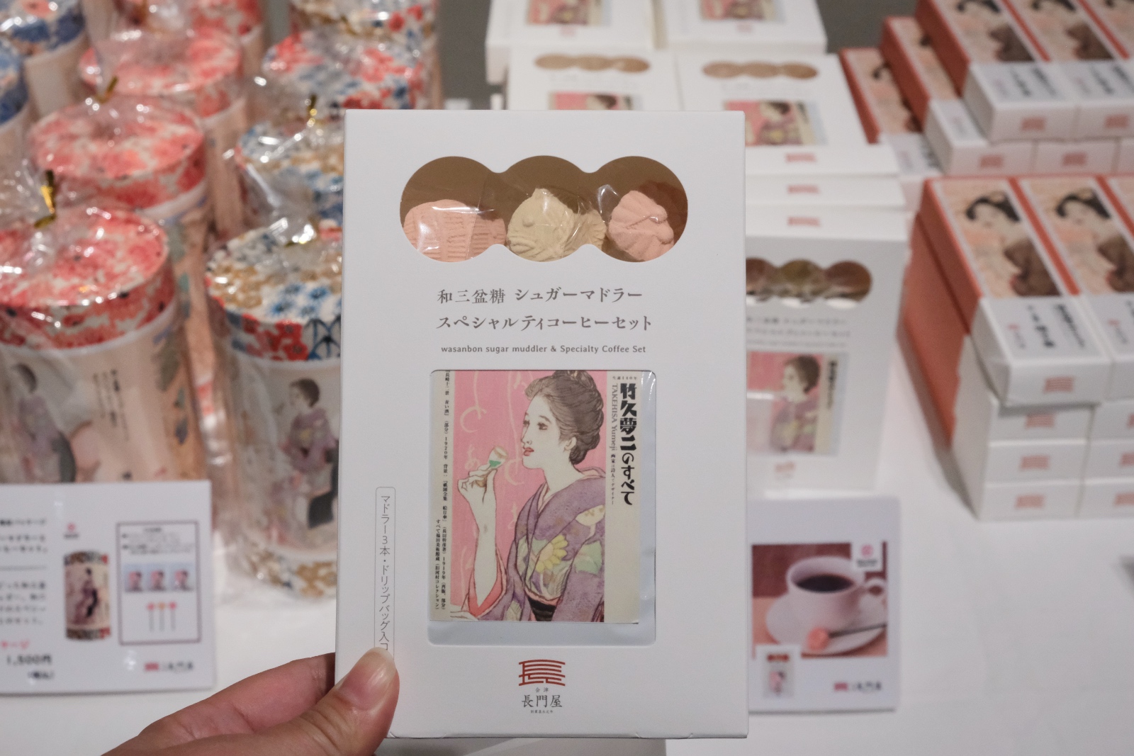 こちらは会津若松市の老舗和菓子店「長門屋」さんとのコラボ商品。和三盆のシュガーマドラーと珈琲のセット。その他、練羊羹と塩羊羹も。