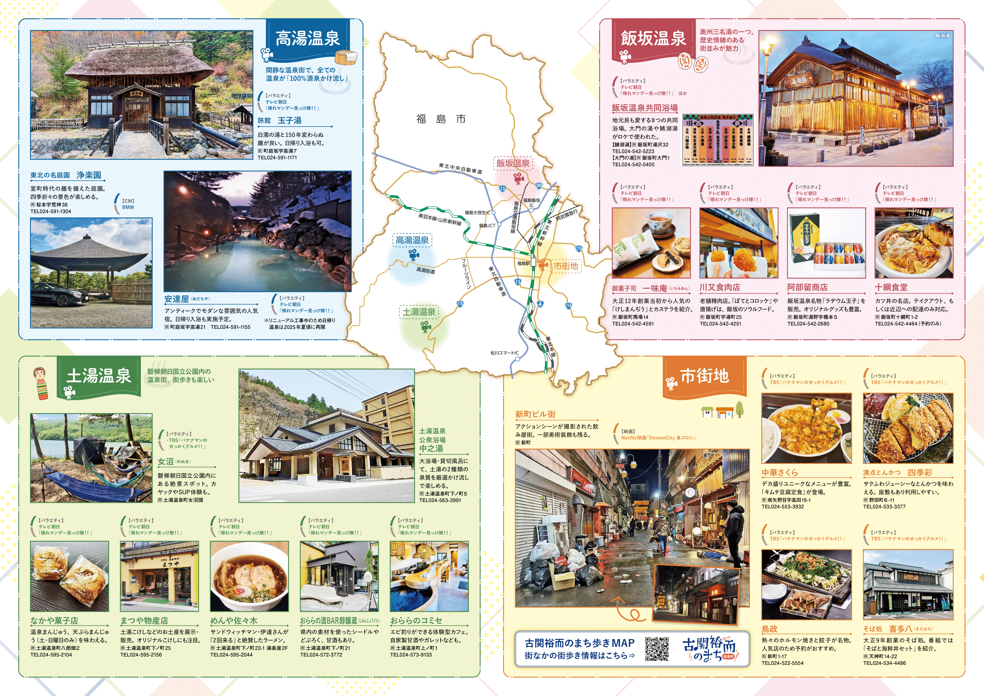 ロケ地ガイドでは市内を4つのエリア(高湯・土湯・飯坂・市街地)に分けて、撮影スポットや立ち寄りグルメをわかりやすく紹介しています。