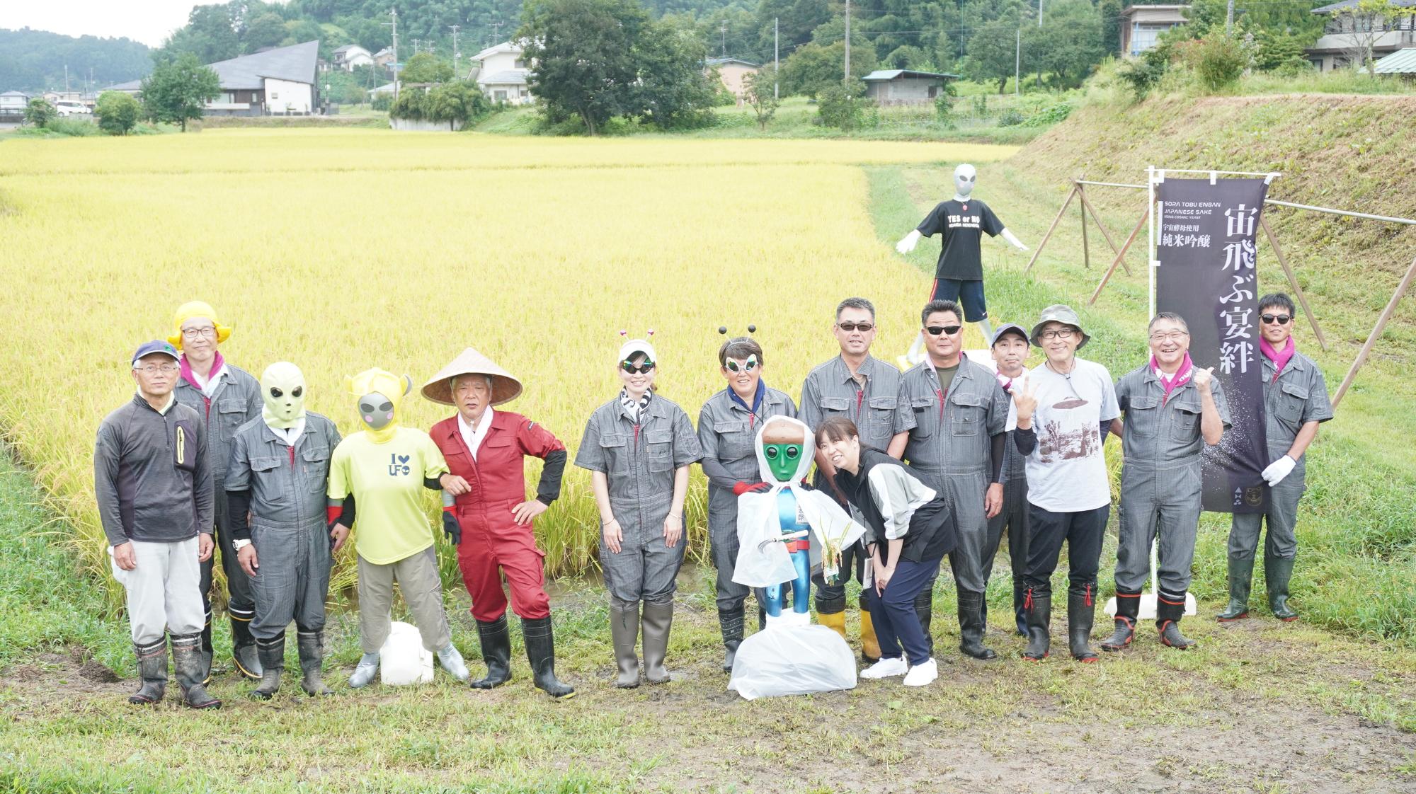 プロジェクトメンバーで地酒「宙飛ぶ宴絆」用の酒米「夢の香」の稲刈り