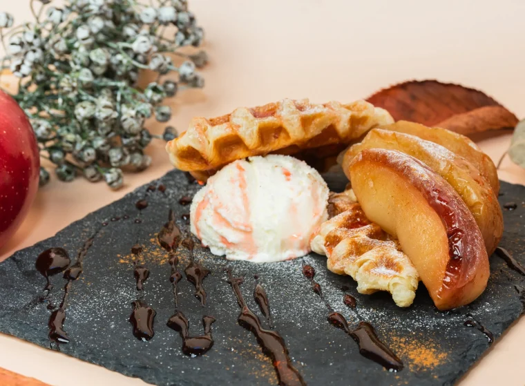 クロッフルは焼きたて。外はサクッ、中はふわもちの食感が心地よく、そこへ合わせるのは、福島市産りんごのコンポート。甘さと酸味のバランスが絶妙 です。