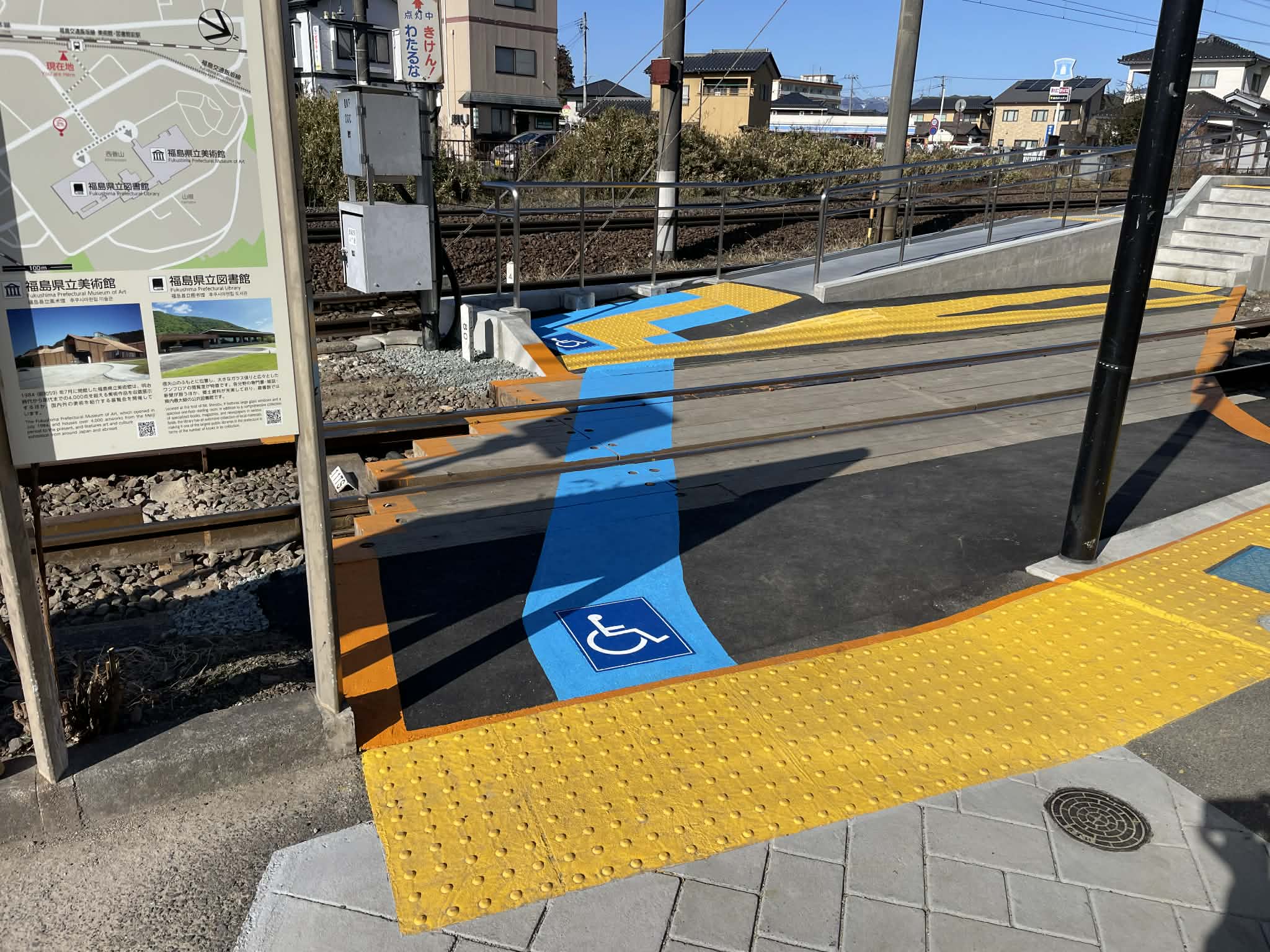 福島県立美術館の最寄り駅、福島交通飯坂線「美術館図書館前駅」では、バリアフリー化の工事が完了し、スロープや点字ブロックなどが新しく整備されました。これにより、車いすやベビーカーをご利用の方、足腰に不安のある方も、これまで以上に安心してご利用いただけるようになりました。