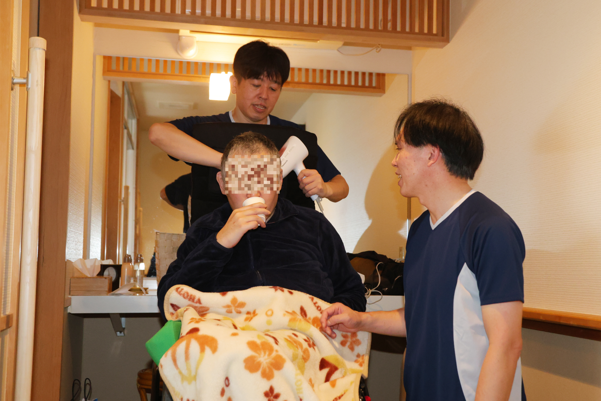 利用者さんからは「気持ちよかった」「家族で温泉旅行は迷惑をかけてしまうので諦めていたが、プロの力を借りて安心して入浴できた」「この企画のおかげで、久しぶりに温泉に浸かってリフレッシュできた」「また機会があれば利用したい」など大満足の声。