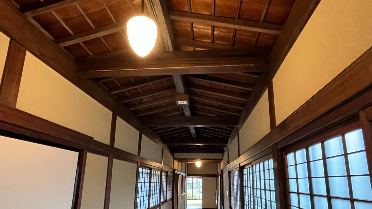 玄関を抜けると、中庭に面した畳廊下が広がっています。この廊下には、中央が両端より高く盛り上がった「舟底天井」が採用されており、天井の低さを感じさせない造りになっていました。