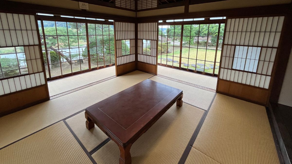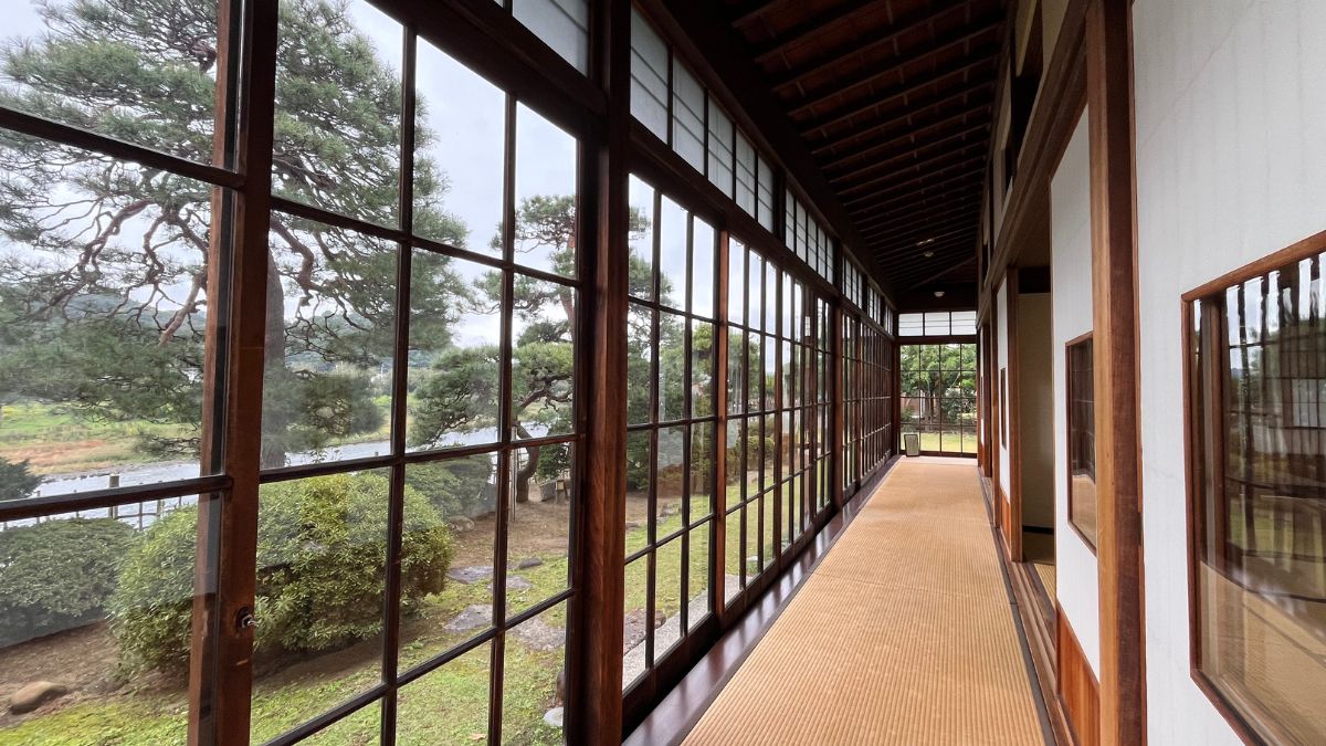 廊下の先には、日本庭園に面した明るく広い和室があります。取材日はあいにくの曇り空でしたが、ガラス張りの縁側に囲まれた室内はとても心地よく、やわらかな光に包まれていました。